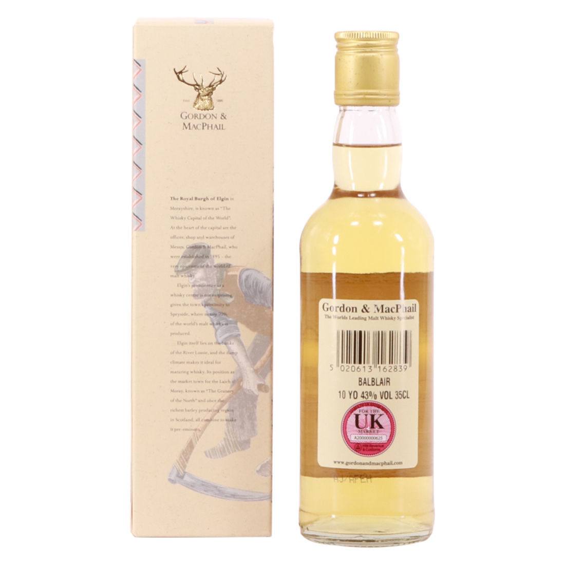 This is a 35cl bottle of 10 year old single malt from the Eastern Highland distillery, Balblair, in Edderton. The whisky was selected, produced, matured and bottled by Gordon & MacPhail.