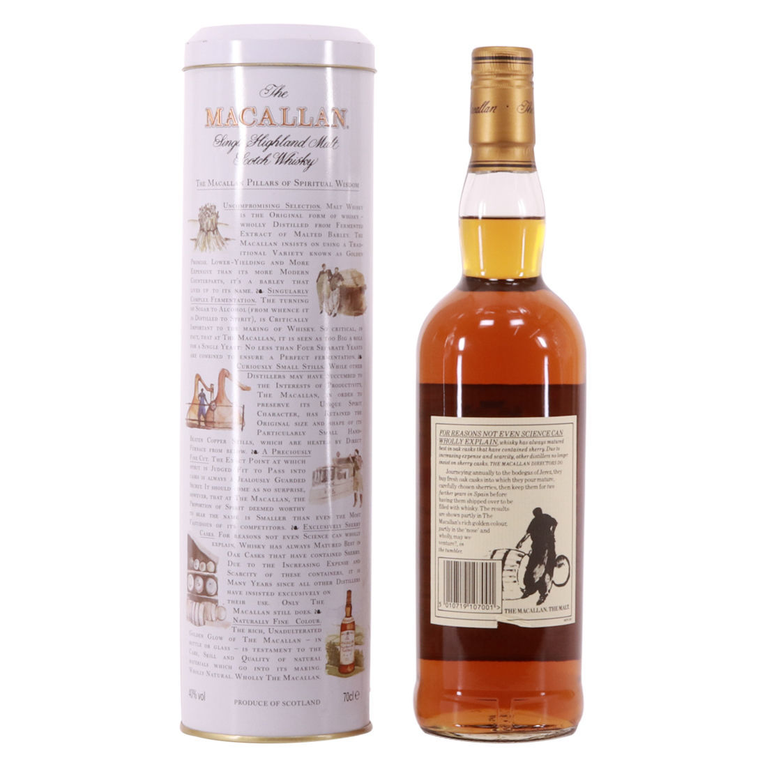 A 1990's bottling of 10 year old Macallan, matured in sherry wood with a presentation tin depicting Easter Elchies House.