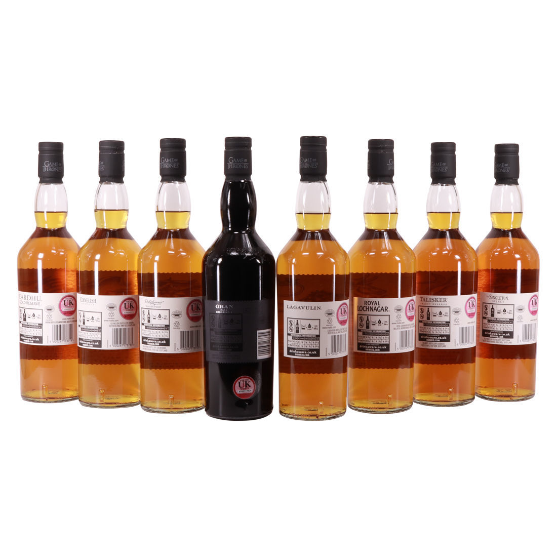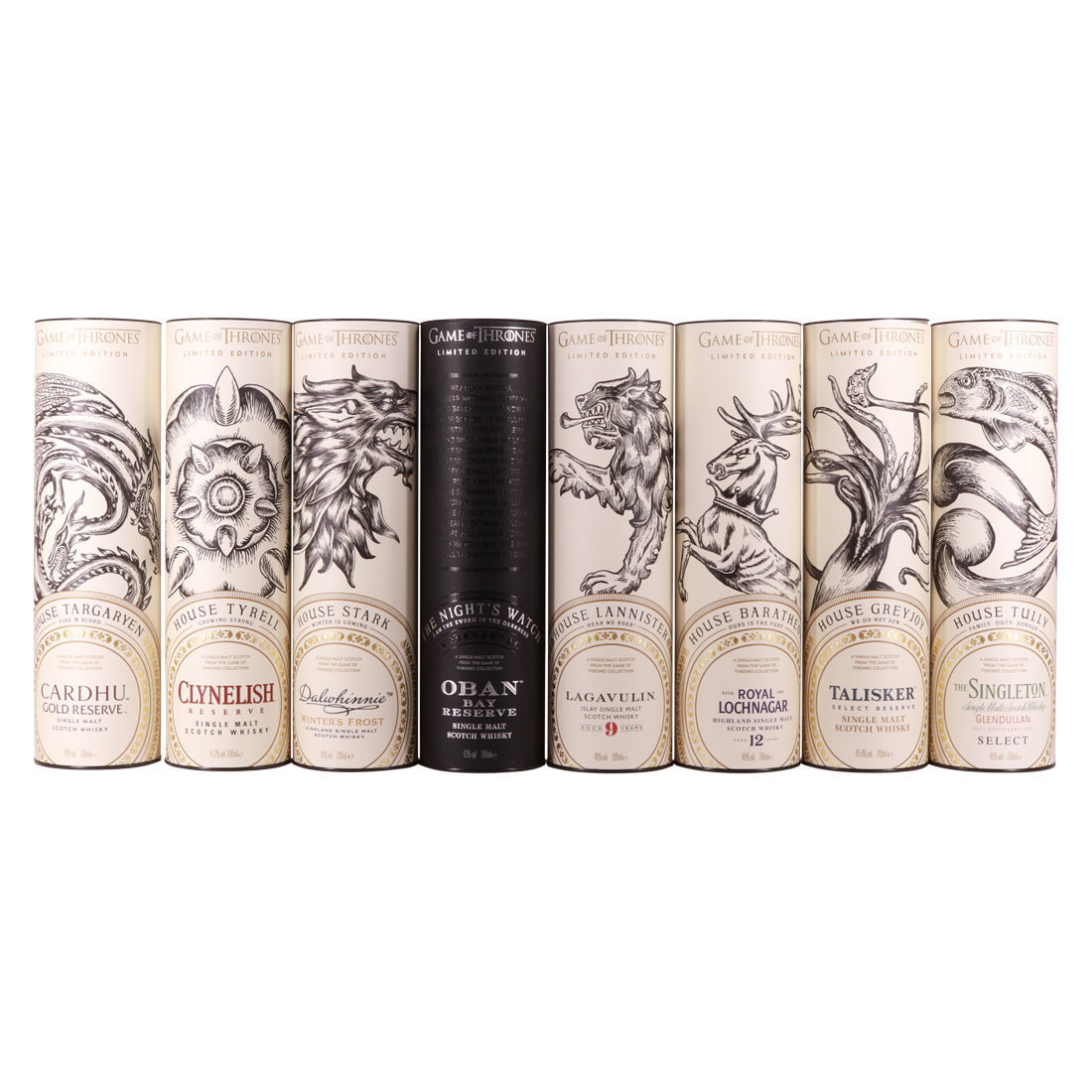 Each of the Game of Thrones Scotch whiskies has been paired with a particular house from the seven kingdoms in the television series, plus the Night’s Watch guard.
