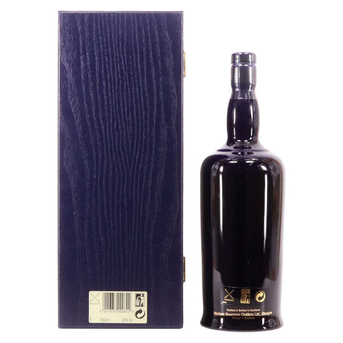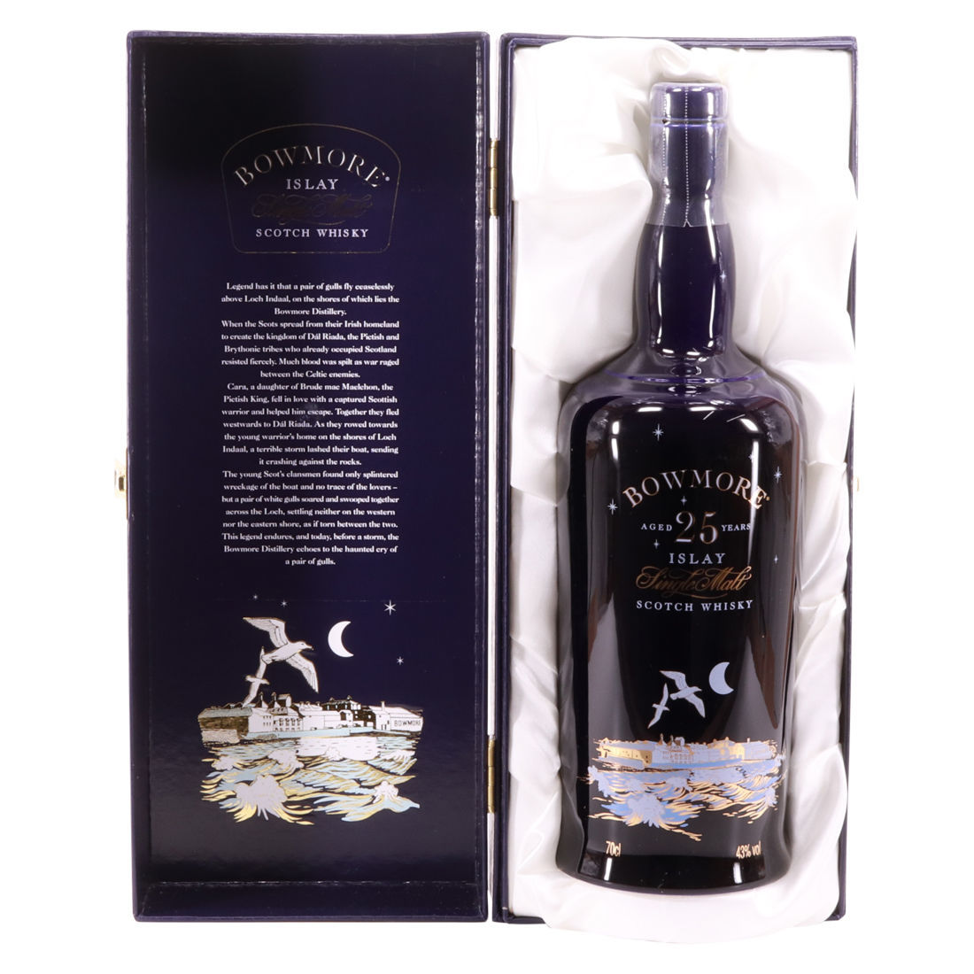 A stunning 25 year old single malt bottling from Bowmore. It comes in a rare blue ceramic bottle featuring two gulls and with a beautiful, lined presentation case to celebrate one of the legends of Bowmore. The Gulls Legend is printed inside the lid of the presentation case: