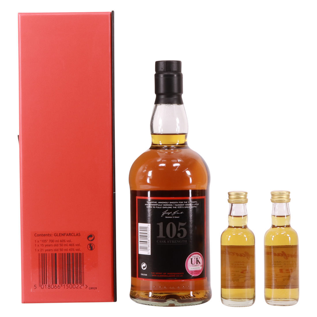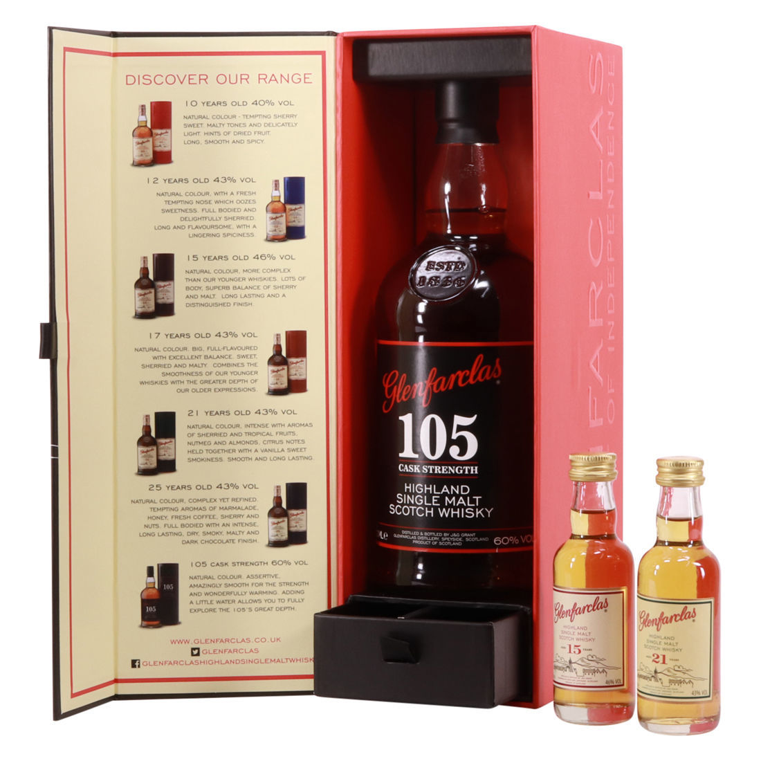 Well presented this Glenfarclas 105 Tasting Pack contains 1 x 70cl bottle of 105 and 2 x 5cl bottles (1 x 15 Year Old and 1 x 21 Year Old). All presented in a nice presentation box, bottle on display and the minatures kept in a draw below.