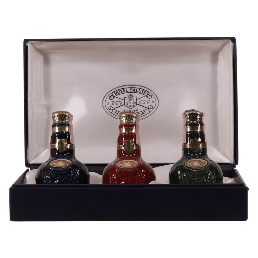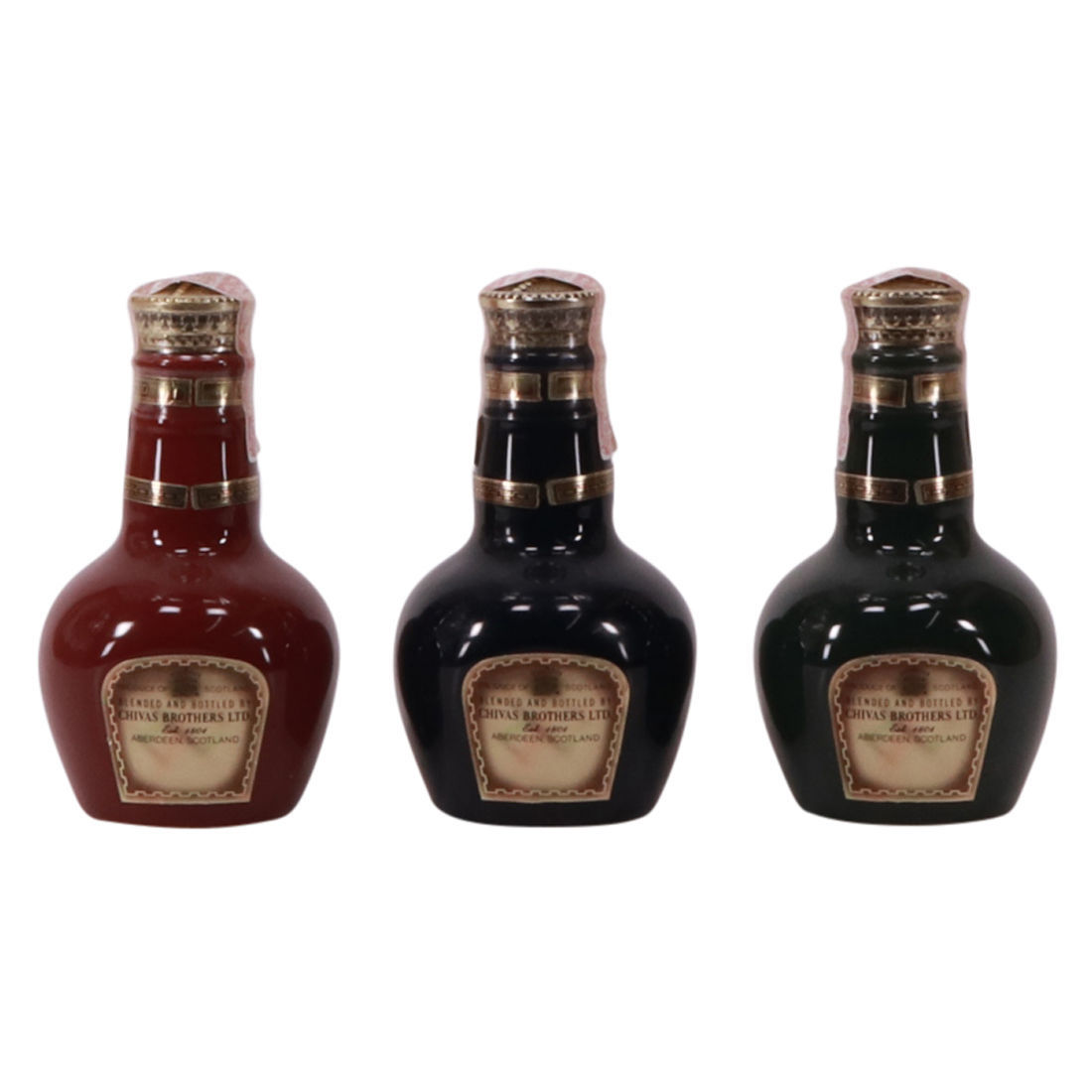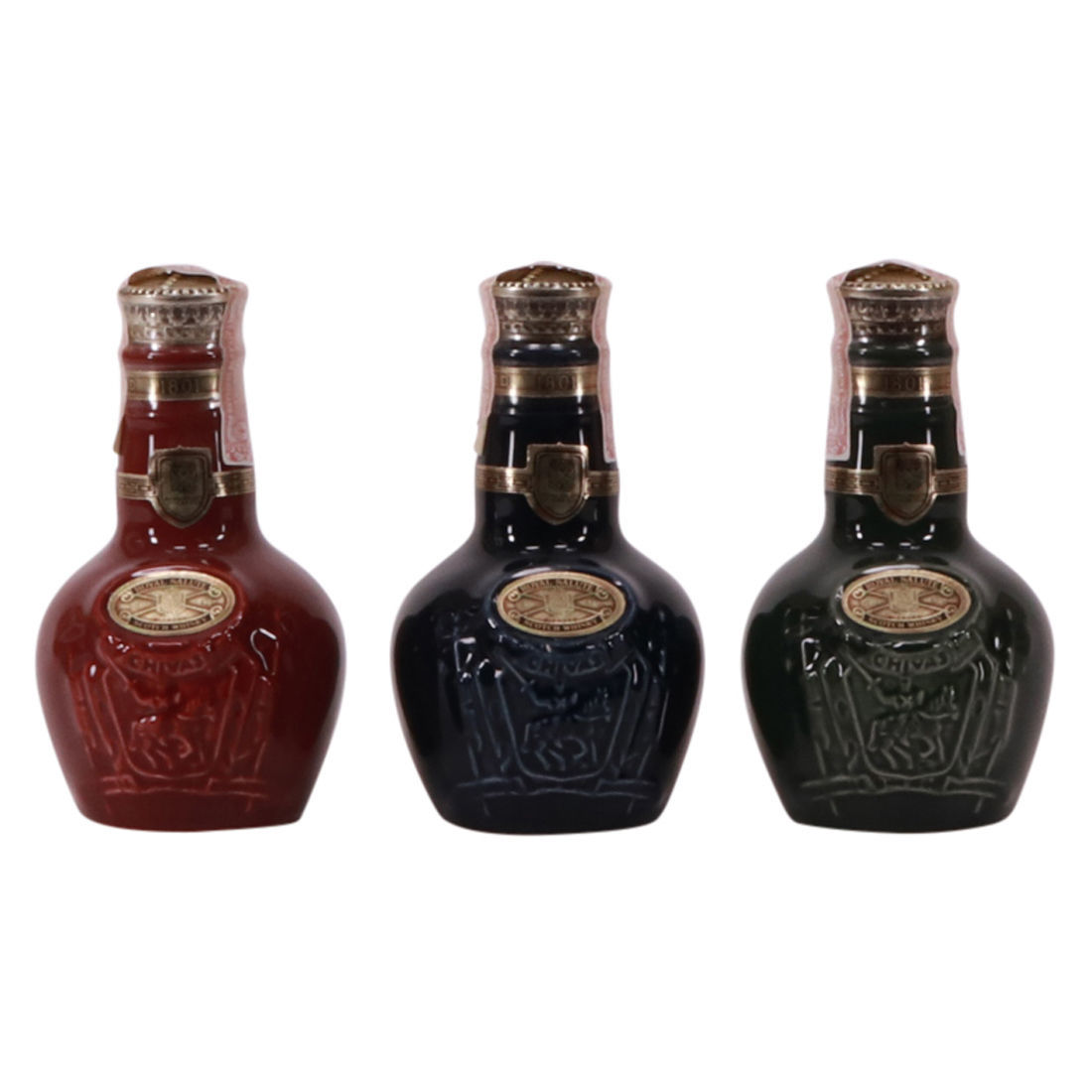 Three Chivas Royal Salutes, in miniature Wade decanters. Ruby, Emerald and Sapphire.