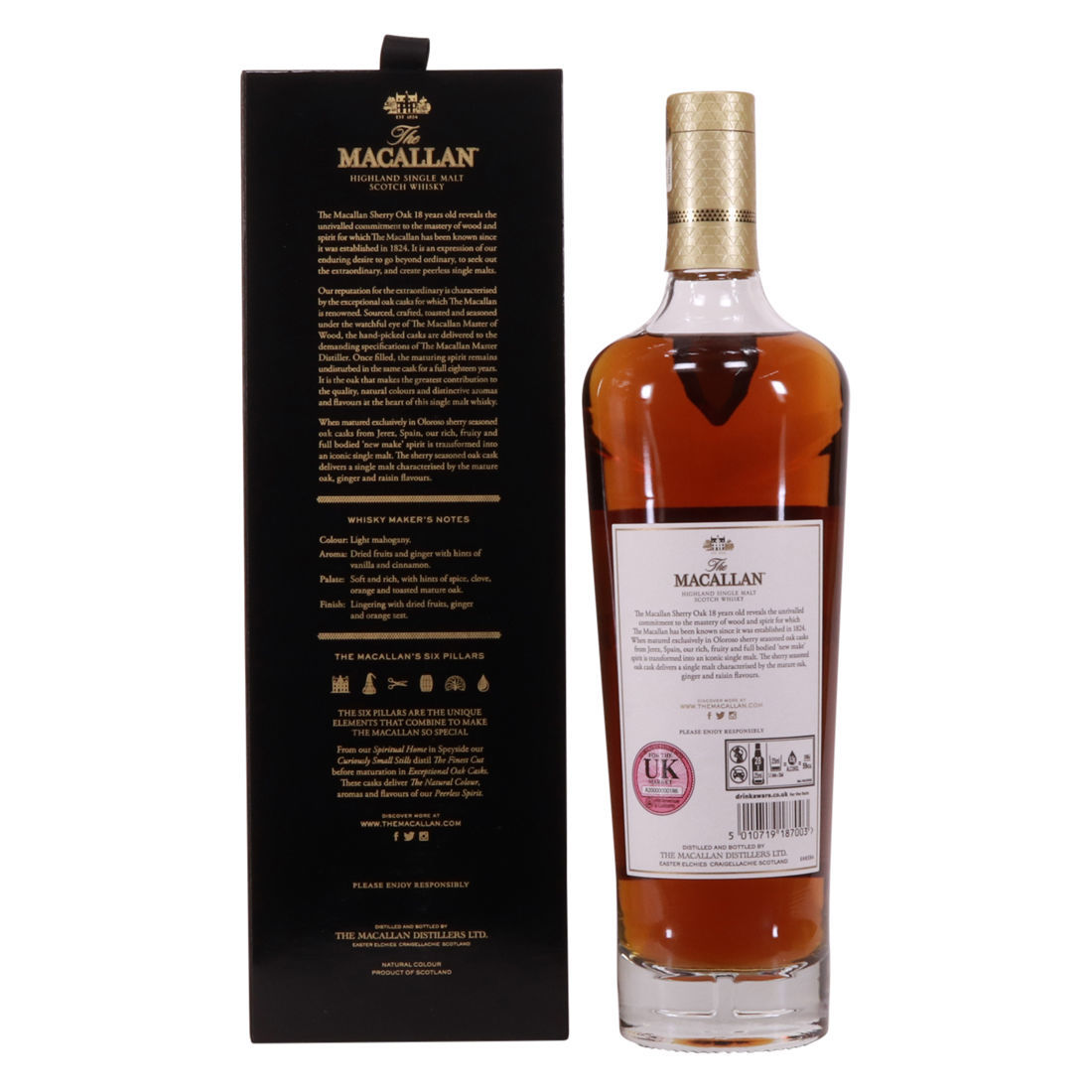 This annual release of The Macallan's popular 18 Year Old Sherry Oak is matured exclusively in sherry seasoned casks, built from both Spanish and American oak, providing a beautifully dark flavour with rich aromas.