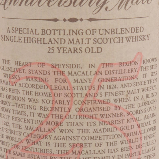 This is an incredibly rare 25 year old Speyside single malt. It was distilled at The Macallan in 1968. It was bottled for the UK market in 1994 for the highly decorated Anniversary Malt range.