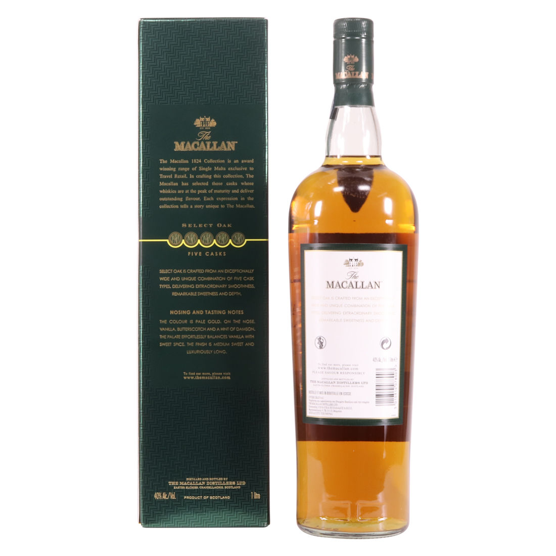 The Macallan Select Oak is crafted from a broad and unique selection of five casks which deliver a great smoothness, sweetness and depth. It is a lighter style of Macallan with sweet notes of butterscotch and vanilla.