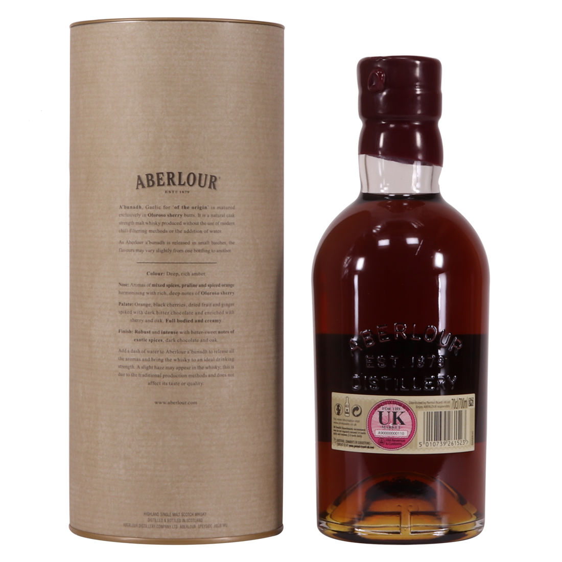 Meaning 'of the origin' in Gaelic, A'bunadh is made in homage to Aberlour's founder, James Fleming. This is batch No. 56 of the popular A'Bunadh single malt. It has been matured in Spanish Oloroso sherry butts and bottled at cask strength at 61.2% creating a dark luxurious whisky.