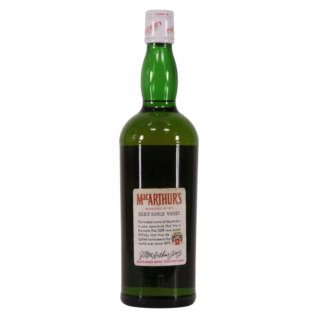 A bottle of MacArthur's Select blended Scotch whisky, produced in the 1970s. It as distilled, blended and bottled by J MacAurthur Jr & Co. It was bottled at 70 proof (40% ABV) and 26 1/3 FL. OZ. (approx. 76cl).