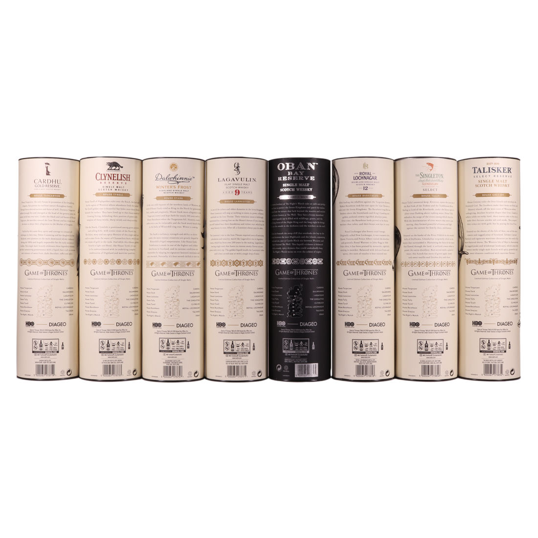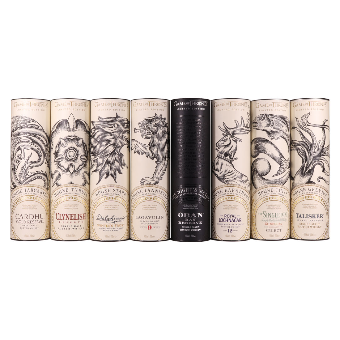 Each of the Game of Thrones Scotch whiskies has been paired with a particular house from the seven kingdoms in the television series, plus the Night’s Watch guard.