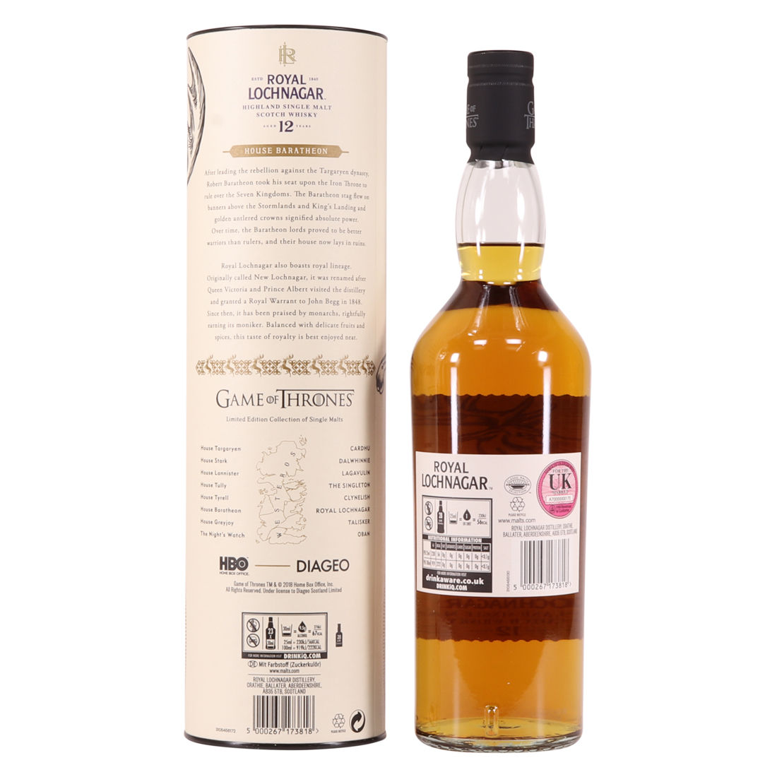 This limited-edition 12 year old single malt from Royal Lochnagar is part of Diagio's 2018 collaboration with HBO. Each single malt in the series relates to the land of houses of the Game of Thrones television series. The bottle is decorated with a rampant black Stag, the sigil of House Baratheon that once flew on banners above the Stormlands and King’s Landing signifying absolute power.