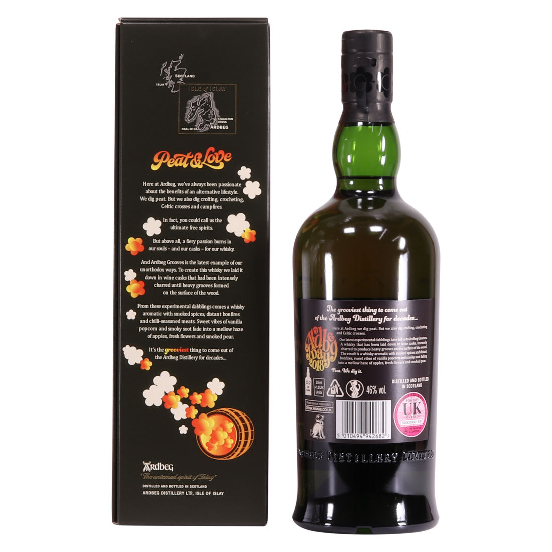 This limited edition Islay single malt was released to mark the 2018 Ardbeg Day at the Islay Festival of Music & Malt.  The theme is a throwback to the Island's 1960s spirit, embodying the ideals of 'peat & love'! Ardbeg Grooves is crafted with ex-wine casks that are re-charred to create heavy grooves in the wood, allowing more interaction with the spirit and creating a richer flavour.