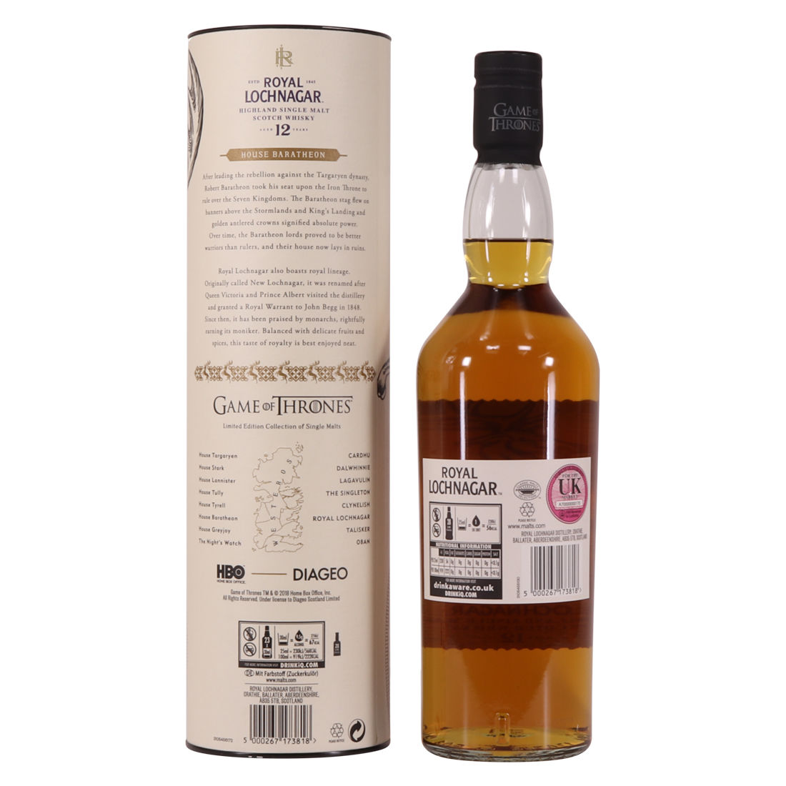 This is a limited-edition 12 year old single malt from Royal Lochnagar and it is part of Diagio's 2018 collaboration with HBO.  Every single malt in the series is related to the land of houses of the Game of Thrones television series.  The Royal Lochnagar bottle is decorated with a rampant black Stag, the sigil of House Baratheon that once flew on banners above the Stormlands and King’s Landing signifying absolute power.