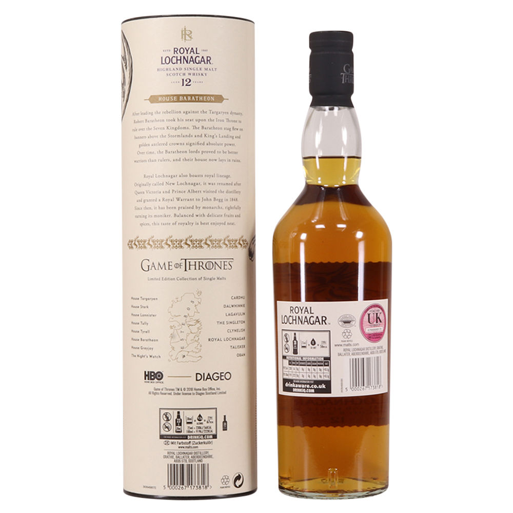 This limited-edition 12 year old single malt from Royal Lochnagar is part of Diagio's 2018 collaboration with HBO. Each single malt in the series relates to the land of houses in the Game of Thrones television series. The bottle is decorated with a rampant black Stag, the sigil of House Baratheon that once flew on banners above the Stormlands and King’s Landing signifying absolute power.