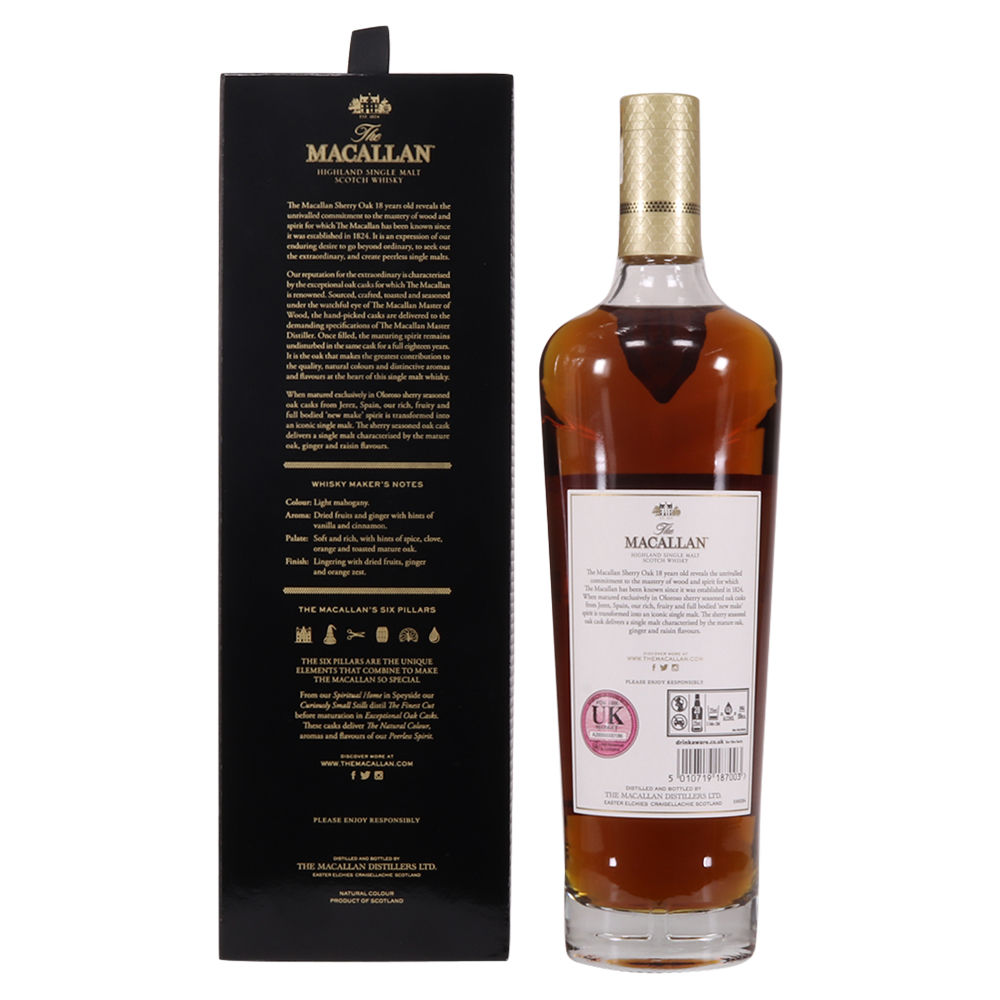 This annual release of The Macallan's popular 18 Year Old Sherry Oak is matured exclusively in sherry seasoned casks, built from both Spanish and American oak, providing a beautifully dark flavour with rich aromas.