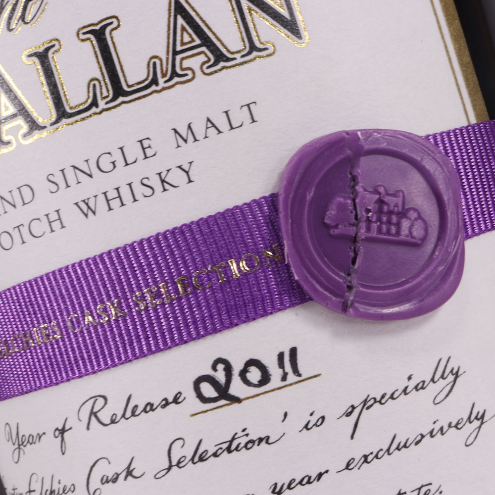 The 2011 Easter Elchies edition was distilled in 1997 and matured in Sherry butt casks before being bottled at 14 years old.  The bottle is presented with the purple bow and wax emblem.