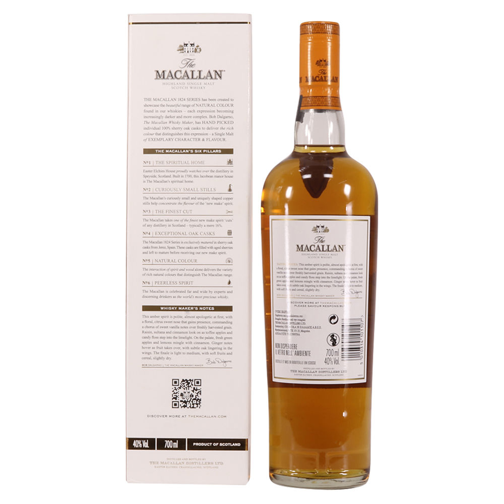 The Macallan 1824 Series celebrates natural colour. The most distinctive and defining characteristic of Macallan is the sherry-seasoned oak casks that are used to mature the whisky. This series shows commitment to 100% natural colour, drawn from wood. The colour of each expression becomes deeper as the range progresses.
