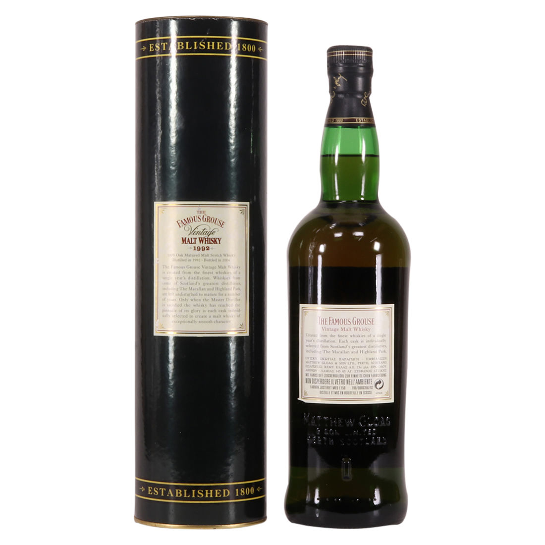 Famous Grouse 1987 12 year old vatted malt with tube. This 1987 Famous Grouse vatting is a blend of 12 year old stocks that were drawn from Macallan, Glenrothes and Highland Park.