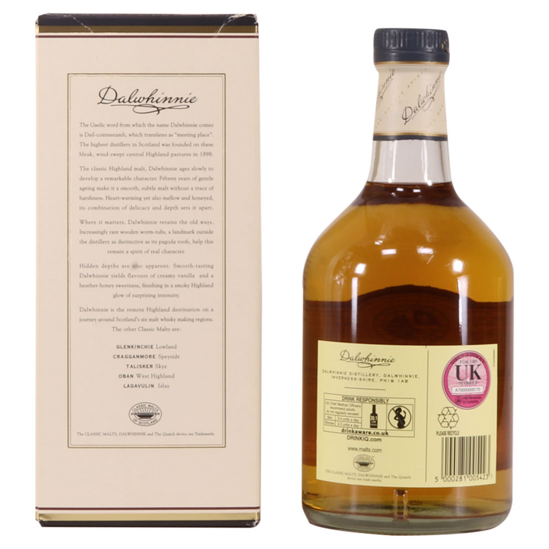 This Dalwhinnie 15 year old is part of Diageo's Classic Malt range. It is a good introduction to single malt whisky – elegant, smooth and medium-bodied, with a light, fruity palate and a whiff of heather on the finish.