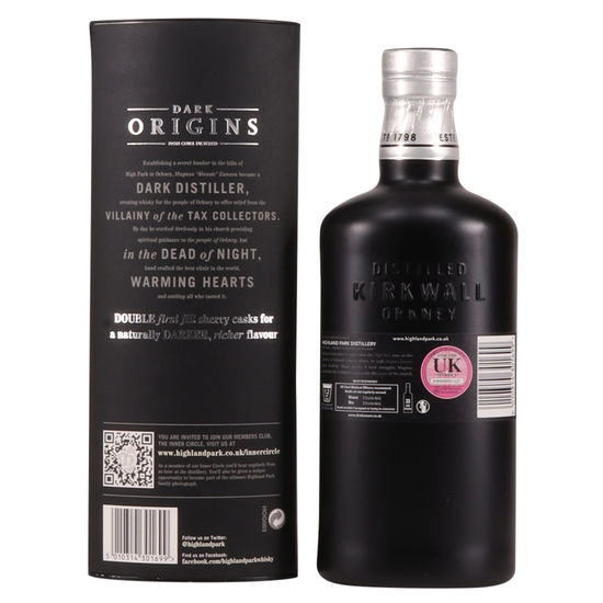 Highland Park Dark Origins was created in memory of the distillery founder Magnus Eunson's illicit distilling on Orkney, back before the distillery was even founded in 1798. Magnus worked as a butcher and church official by day, but by night he was a legendary whisky smuggler and distiller outwitting the exciseman.