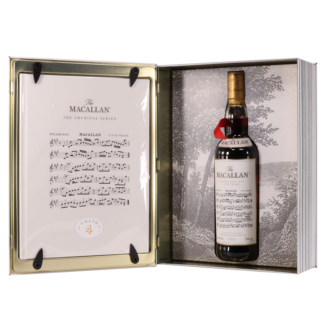The fourth edition in the Archival Series from The Macallan. Folio 4 remembers the legendary advertising campaigns of the 1970s, 1980s and 1990s that brought The Macallan to the public’s attention outside of Scotland. It is presented in a beautiful book shaped, tin case. It features an advertisement including a Strathspey composed by James Scott Skinner (1843-1927). The advert notes that Skinner was so moved by his favourite malt he created a unique piece of music featuring his signature lilting notes with the simple catchphrase: “The Macallan. The Malt.”