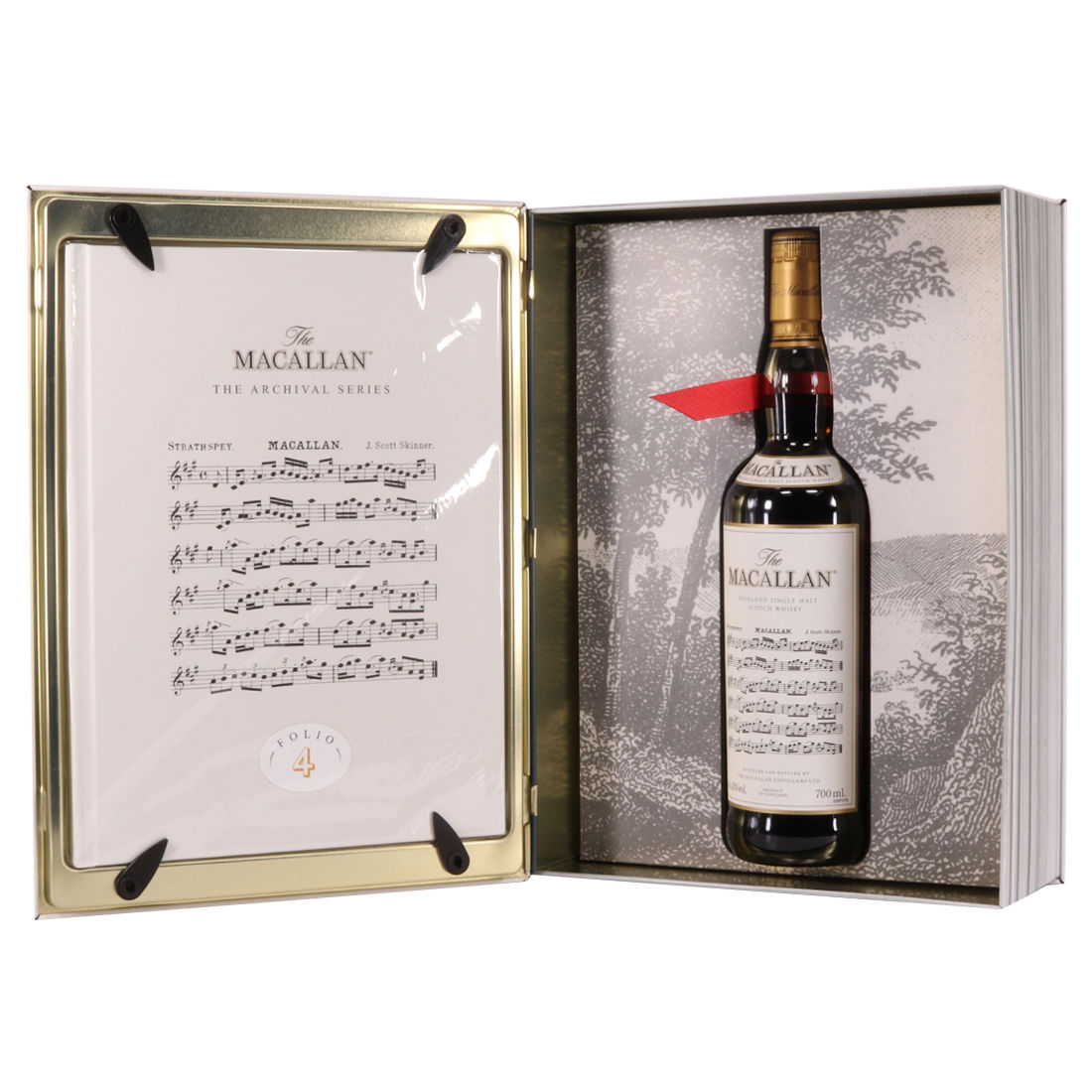 The fourth edition in the Archival Series from The Macallan. Folio 4 remembers the legendary advertising campaigns of the 1970s, 1980s and 1990s that brought The Macallan to the public’s attention outside of Scotland. It is presented in a beautiful book shaped, tin case. It features an advertisement including a Strathspey composed by James Scott Skinner (1843-1927). The advert notes that Skinner was so moved by his favourite malt he created a unique piece of music featuring his signature lilting notes with the simple catchphrase: “The Macallan. The Malt.”