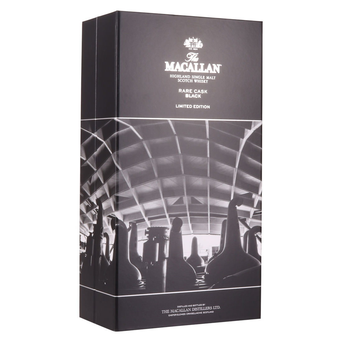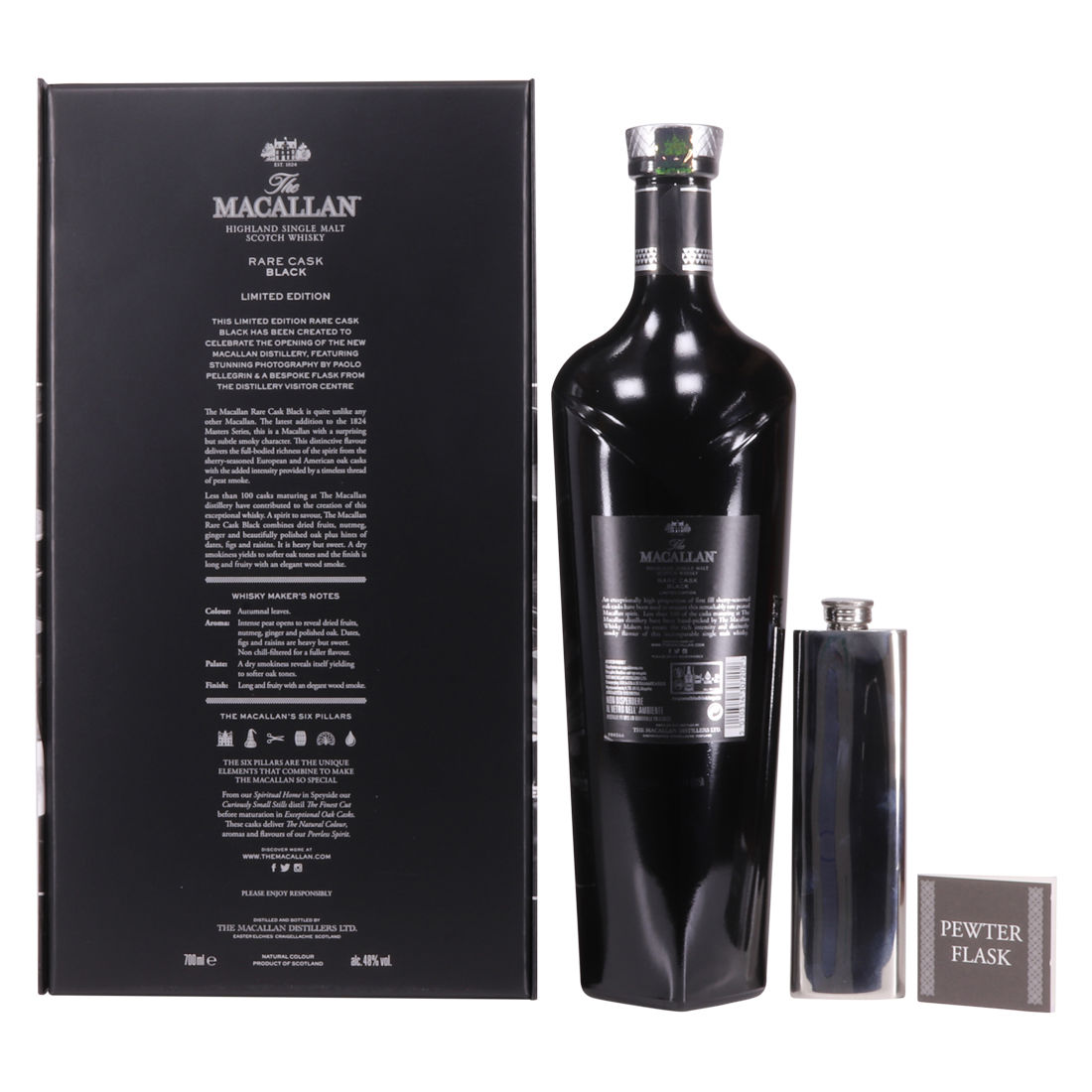 The Macallan Rare Cask Black Limited Edition was released to celebrate the opening of the new Macallan Distillery. It is part of the Macallan 1824 series and features stunning photography by Paolo Pellegrin and a bespoke flask from the Distillery Visitor Centre. The release was a limited edition of 7000 sets, which were only available at airports.