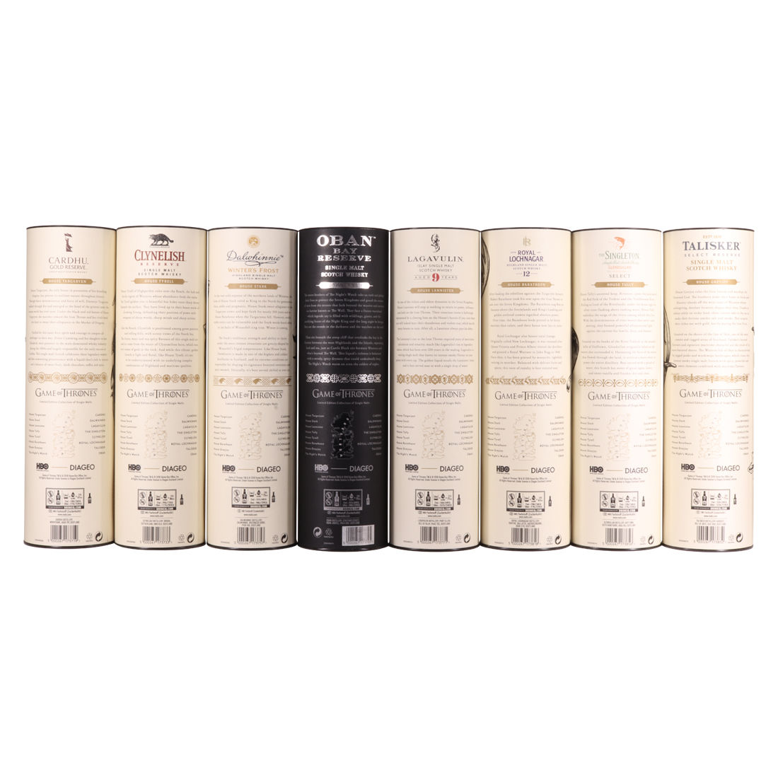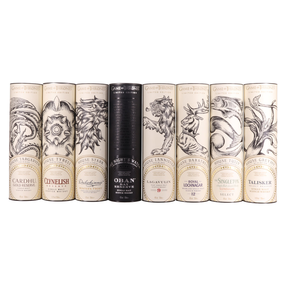 Each of the Game of Thrones Scotch whiskies has been paired with a particular house from the seven kingdoms in the television series, plus the Night's Watch guard.