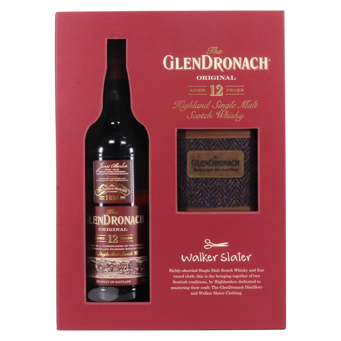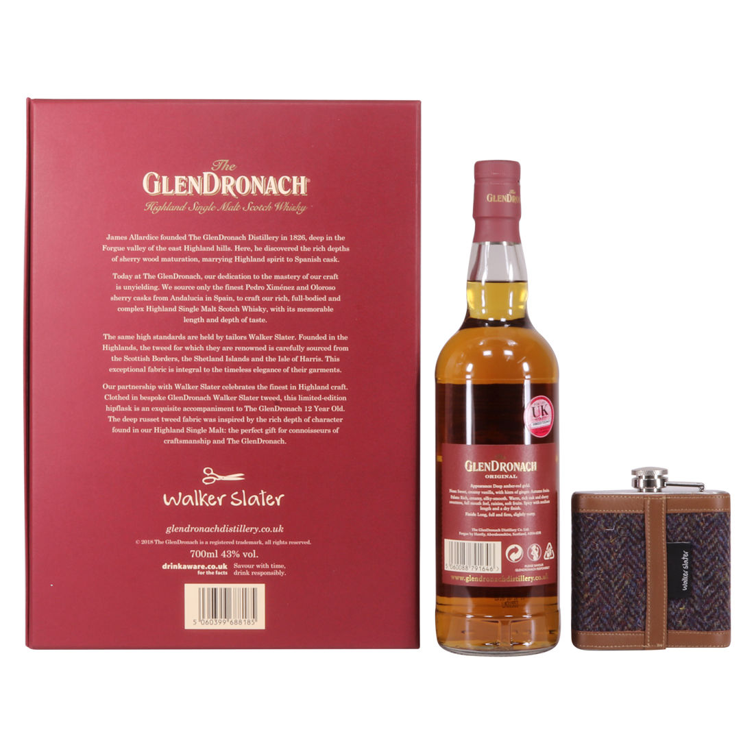 A beautiful gift set from GlenDronach, featuring a bottle of GlenDronach 12 Year Old along with a rather lovely hip flask from world-renowned tweed maker Walker Slater.