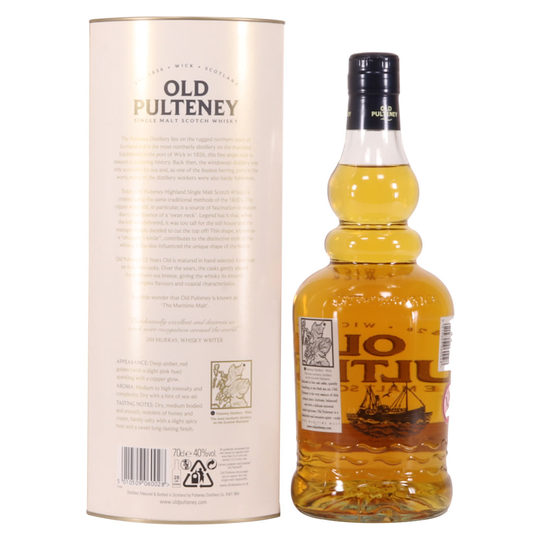 Matured only in air-dried, hand-selected ex-bourbon casks, Old Pulteney 12 year old whisky has won many awards. It has lingering sea tastes with sweetness.