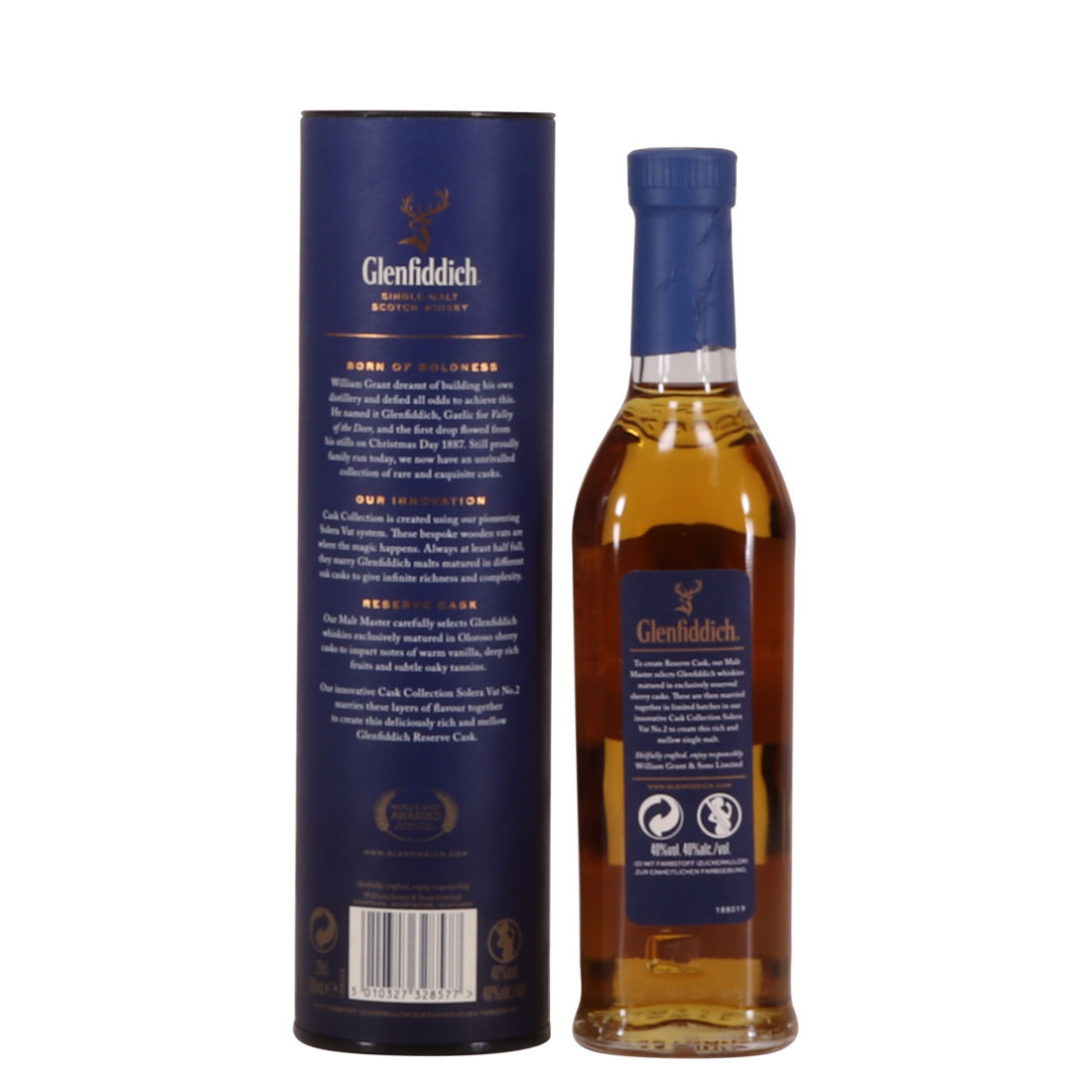 This is a 20cl bottling of Glenfiddich Reserve Cask. It has been matured in distinctive Spanish sherry casks to create a rich and mellow flavour, each individual cask is hand-selected for its flavour profile by Glenfiddich Malt Master, Brian Kinsman. Once selected, casks are married in their unique Solera vat.