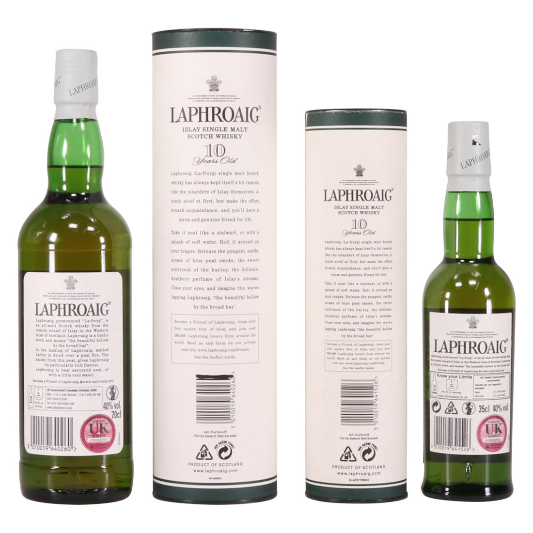 This lot contains 1 x 70cl bottle and 1 x 35cl bottle of the medicinal, 10 year old single malt from Islay's bestselling distillery, Laphroaig. In making Laphroaig, malted barley is dried over a peat fire. The smoke from this peat, found only on Islay, gives Laphroaig its particularly rich flavour.