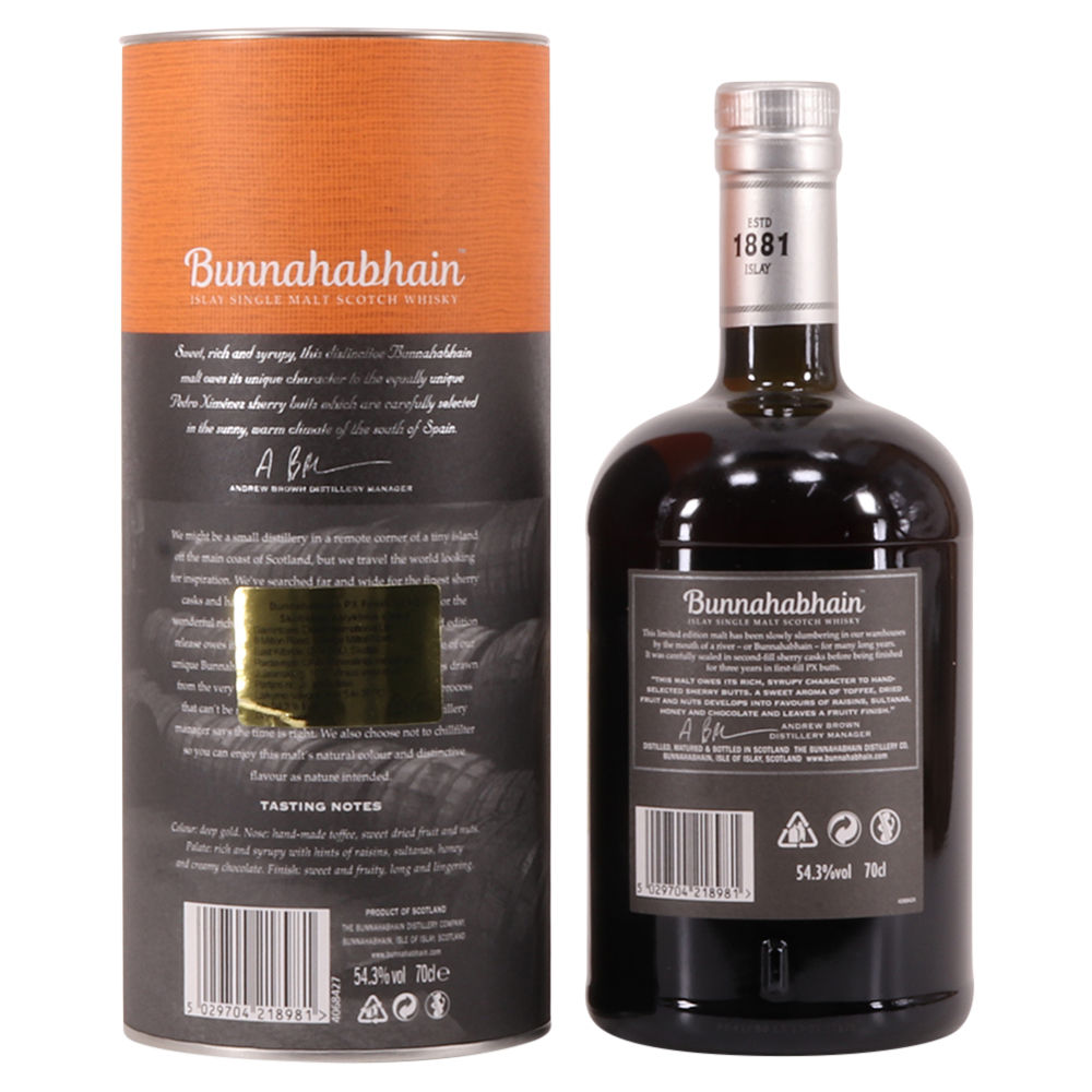 A limited edition bottling from the Bunnahabhain distillery on the north-east coast of Islay. This is a 14 year old single malt, distilled in 2003 and was initially aged in second-fill Sherry casks until 2011. At this point, the whisky was transferred over to yet more Sherry casks - first-fill Pedro Ximénez casks! It was bottled in 2017 at cask strength. This is one of individually numbered 6768 bottles. This bottle is an import.