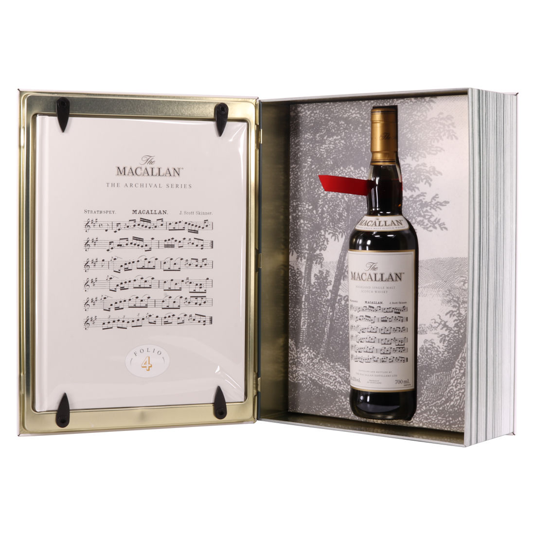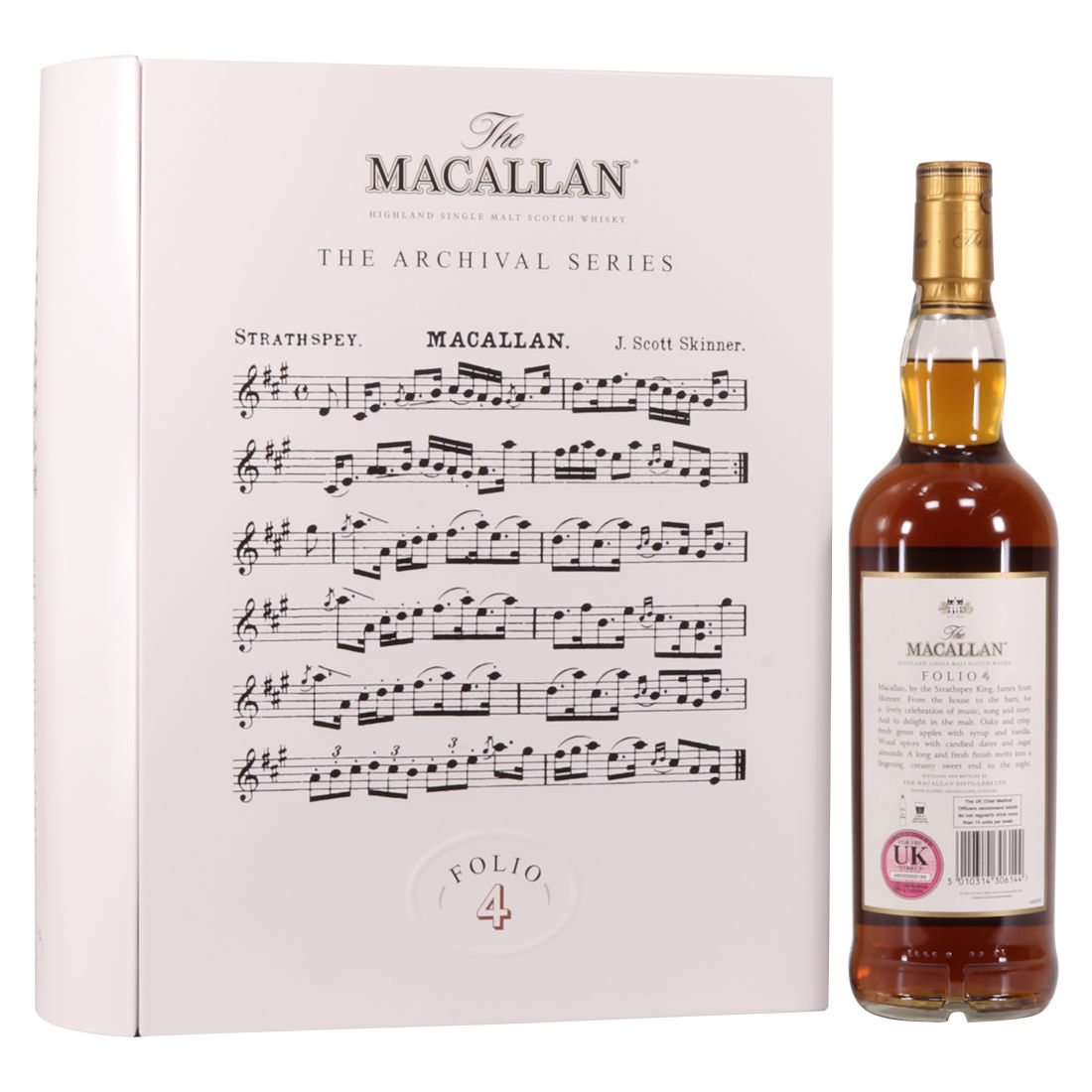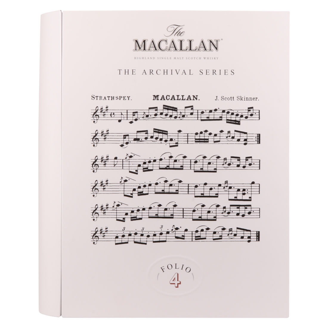 The fourth edition in the Archival Series from The Macallan. Folio 4 remembers the legendary advertising campaigns of the 1970s, 1980s and 1990s that brought The Macallan to the public’s attention outside of Scotland. It is presented in a beautiful book shaped, tin case. It features an advertisement including a Strathspey composed by James Scott Skinner (1843-1927). The advert notes that Skinner was so moved by his favourite malt he created a unique piece of music featuring his signature lilting notes with the simple catchphrase: “The Macallan. The Malt.”