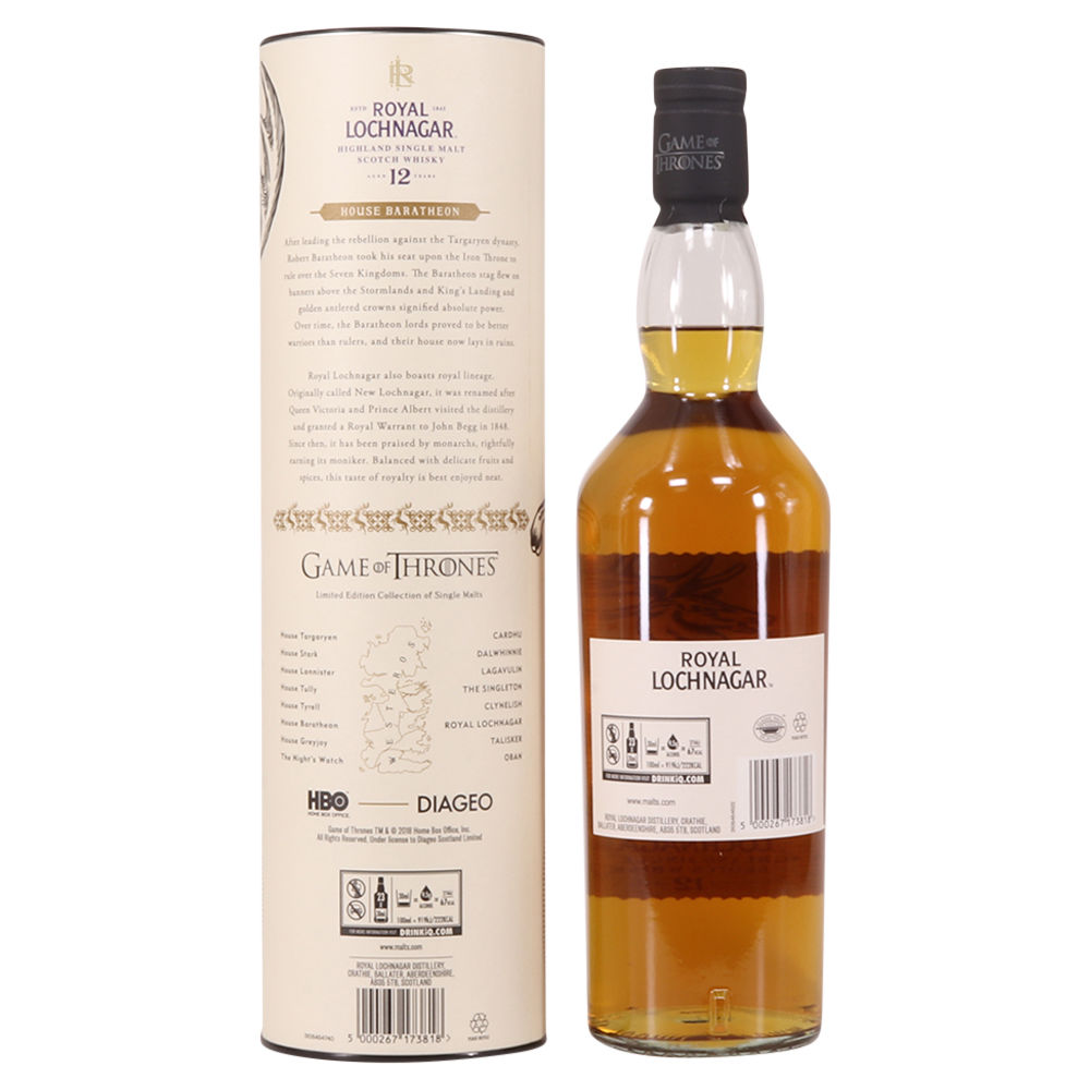 This is a limited-edition 12 year old single malt from Royal Lochnagar and it is part of Diagio's 2018 collaboration with HBO. Each single malt in the series relates to the land of houses of the Game of Thrones television series. The Royal Lochnagar bottle is decorated with a rampant black Stag, the sigil of House Baratheon that once flew on banners above the Stormlands and King’s Landing signifying absolute power.