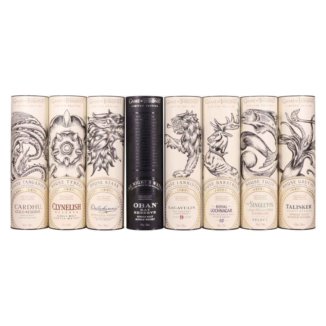 Each of the Game of Thrones Scotch whiskies has been paired with a particular house from the seven kingdoms in the television series, plus the Night's Watch guard.