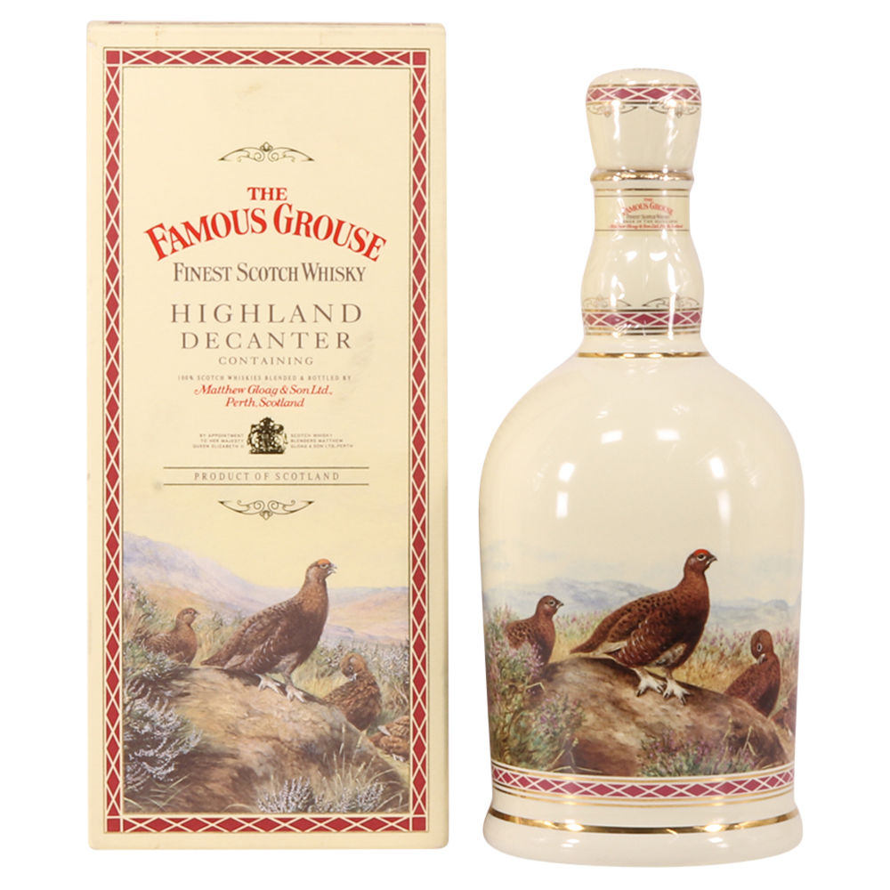 A bottle of Famous Grouse housed within a ceramic 'Highland' decanter. First blended by Matthew Gloag & Son in 1896, as of 2013, it has been the highest selling brand of whisky in Scotland since 1980.