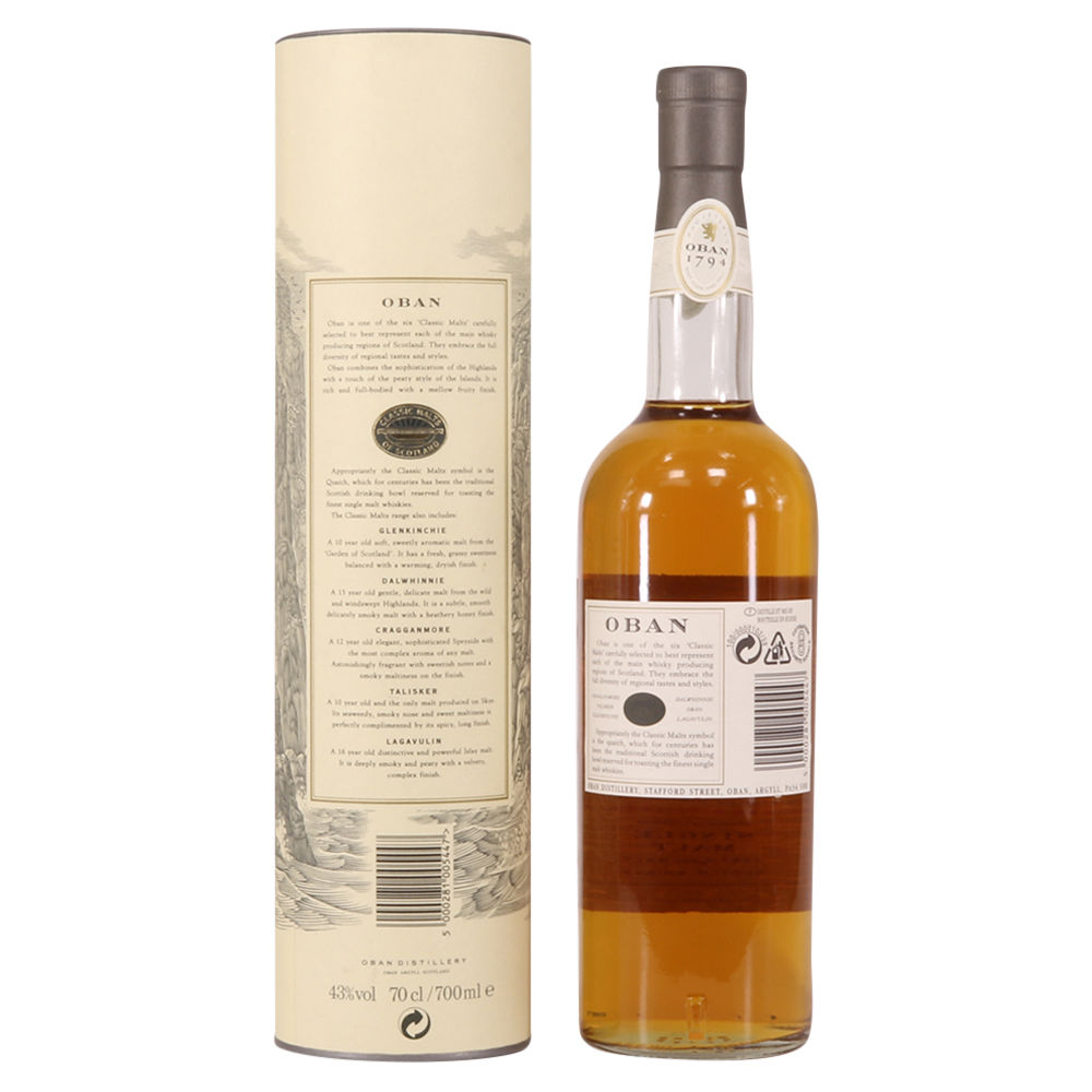 This is the Western Highland representative in Diageo's 'Classic Malt' series, Oban 14 year old single malt is a rich and fruity malt, with notes of heather and smoke. The Oban 14 year old is an award-winning single malt, distilled close to the sea.