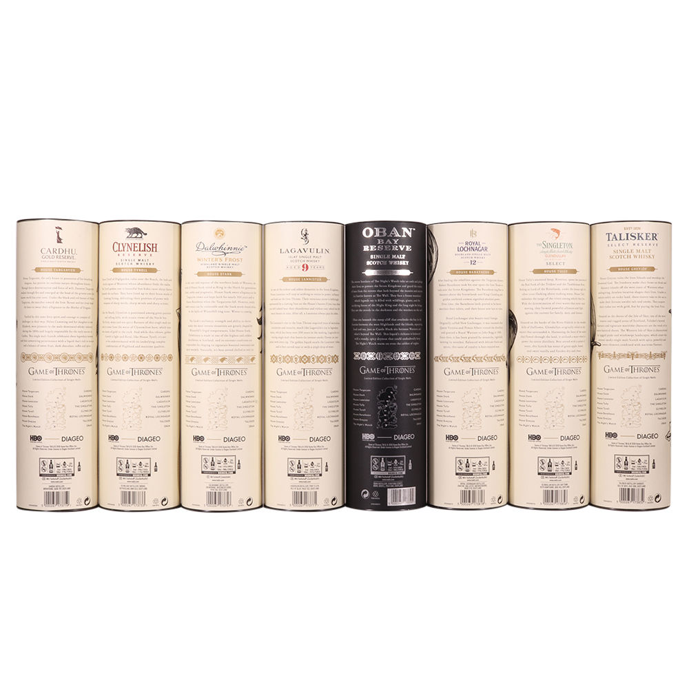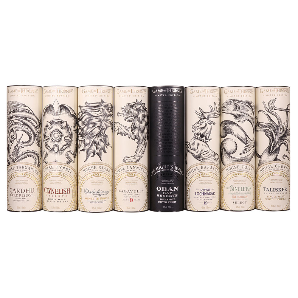 Each of the Game of Thrones Scotch whiskies has been paired with a particular house from the seven kingdoms in the television series, plus the Night's Watch guard.