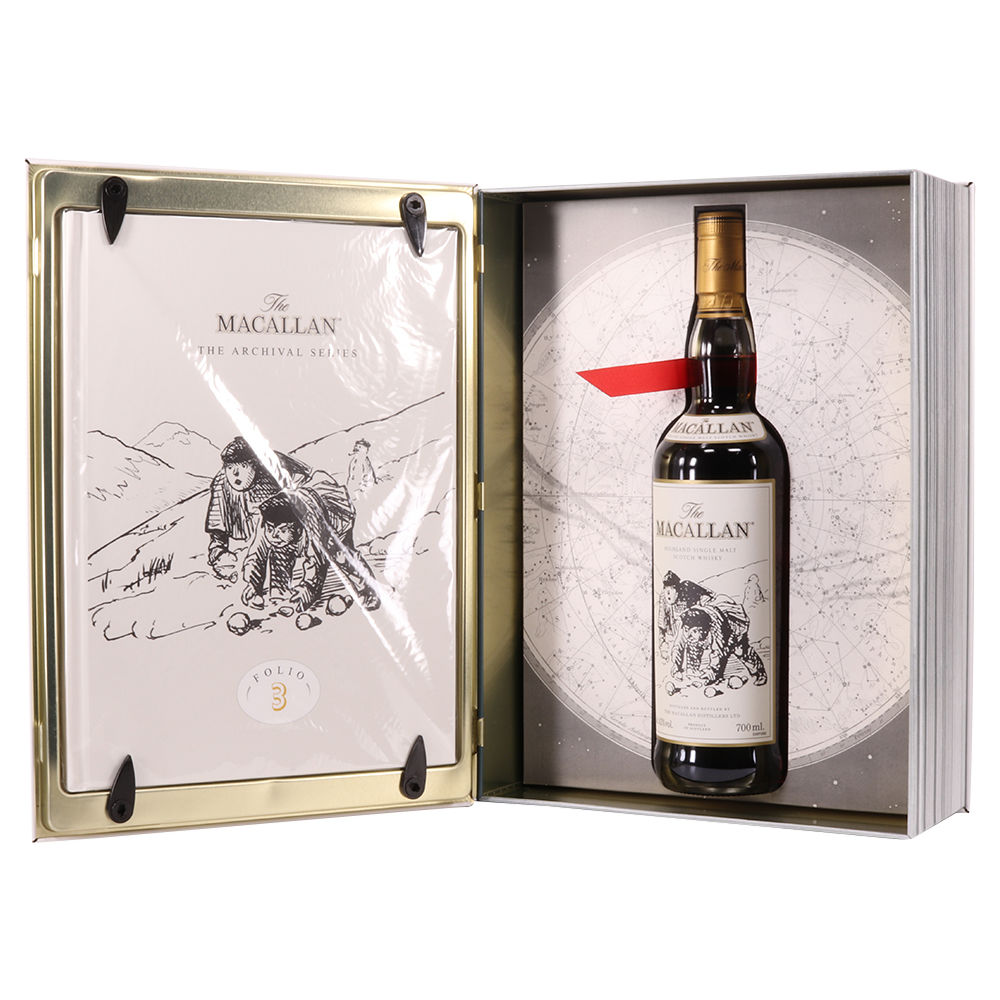 The theme of the Folio 3 is Macallan's advertising campaigns from the 1980s and 1990s. The presentation includes a book containing the best of these. The illustration on the box is from an advert used in a Victorian-era edition of Punch Magazine. It is intended to capture the sentiment that whisky is best produced in cold weather - a remark that Macallan claim was made on their very own estate at Easter Elchies.