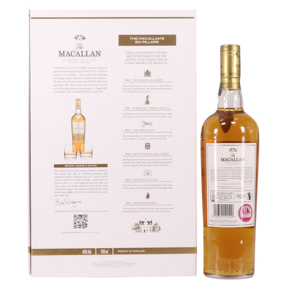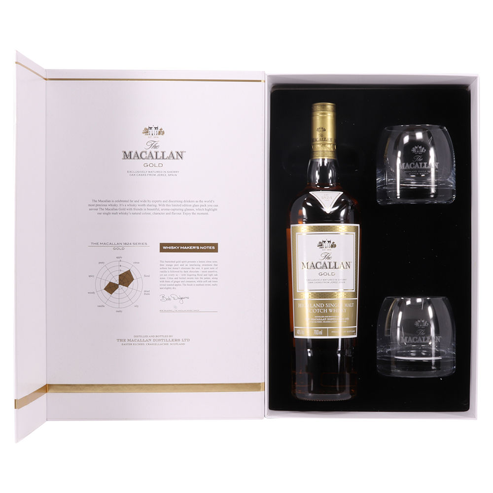 A stylish Macallan gift pack. It contains a 70cl bottle of the Gold expression from the Macallan 1824 Series, and two limited-edition branded Macallan whisky tumblers.