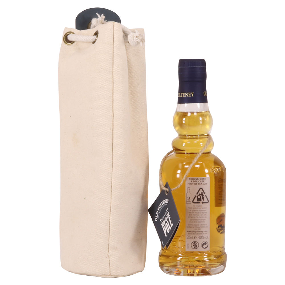 This is a traditional Pulteney dram, with sea air and citrus, packaged in a small sailcloth bag, perfect for hiding away a half bottle when on a small boat.