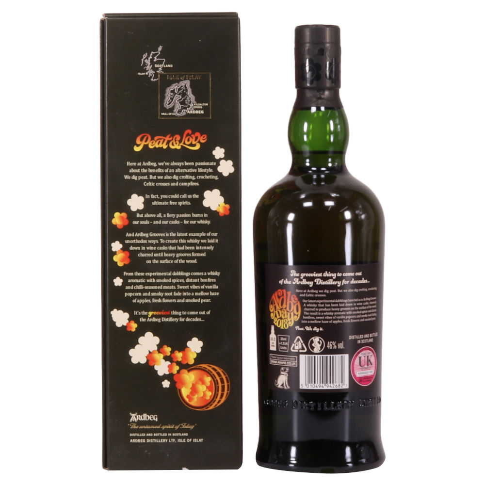 This limited edition Islay single malt was released to mark the 2018 Ardbeg Day at the Islay Festival of Music & Malt. The theme is a throwback to the Island's 1960s spirit, embodying the ideals of 'peat & love'! Ardbeg Grooves is crafted with ex-wine casks that are re-charred to create heavy grooves in the wood, allowing more interaction with the spirit and creating a richer flavour.