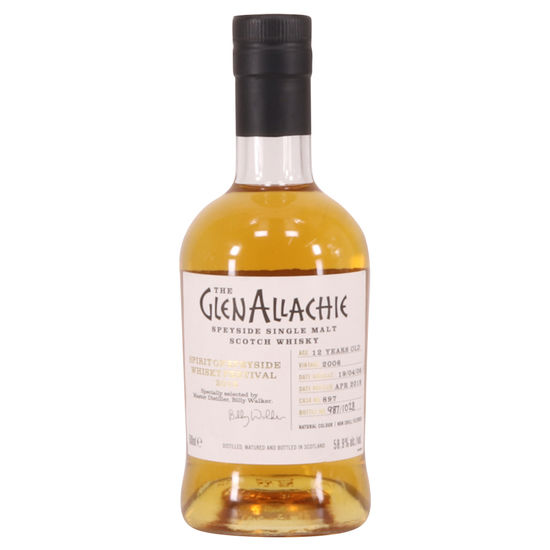 This is a 50cl bottling of 12 year old single malt from GlenAllachie Distillery. It was bottled in April 2018 for the Spirit of Speyside Whisky Festival 2018, from cask No.897. This bottle is signed by Master Distiller, Billy Walker.