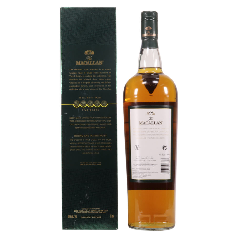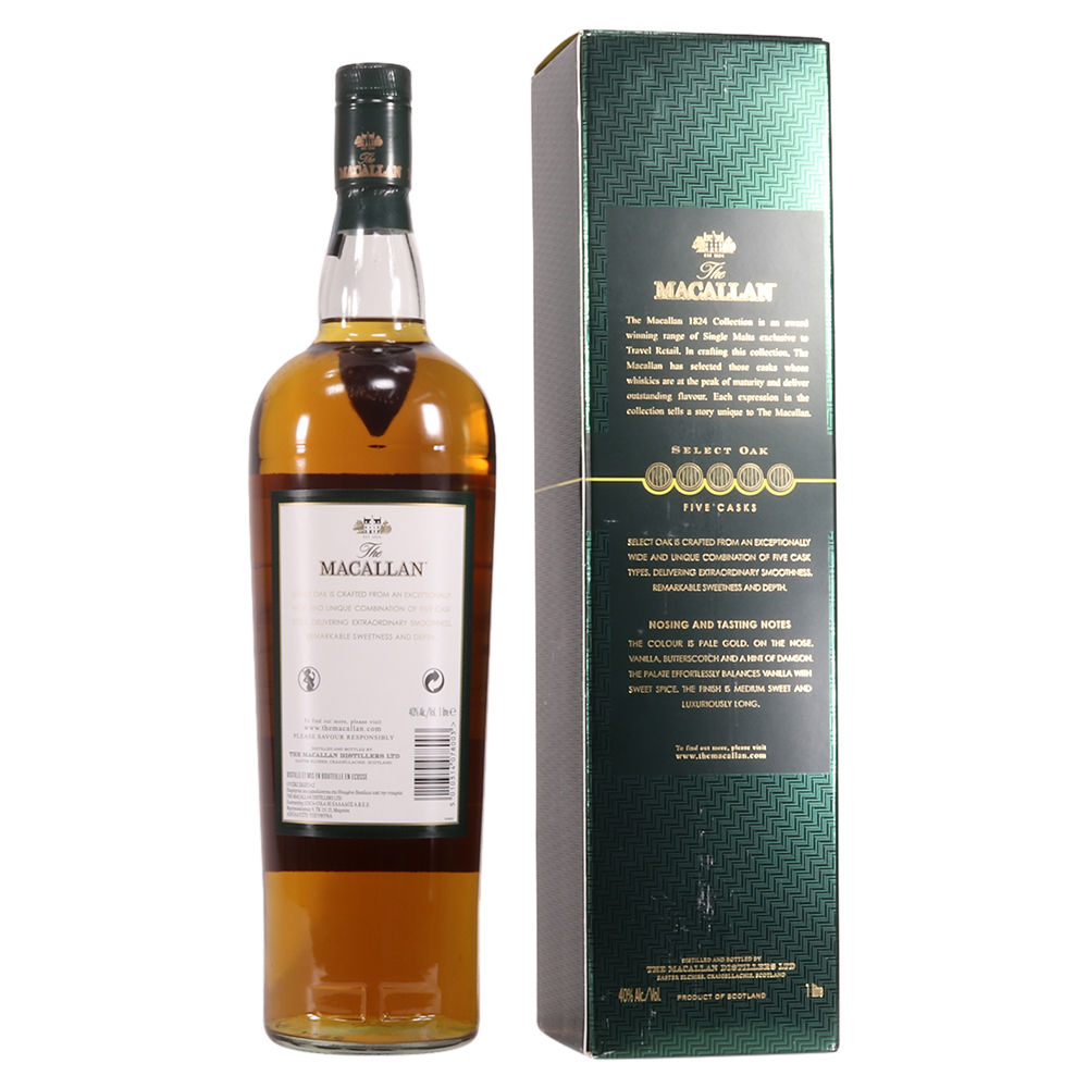 The Macallan Select Oak is crafted from a broad and unique selection of five casks which deliver a great smoothness, sweetness and depth. It is a lighter style of Macallan with sweet notes of butterscotch and vanilla.