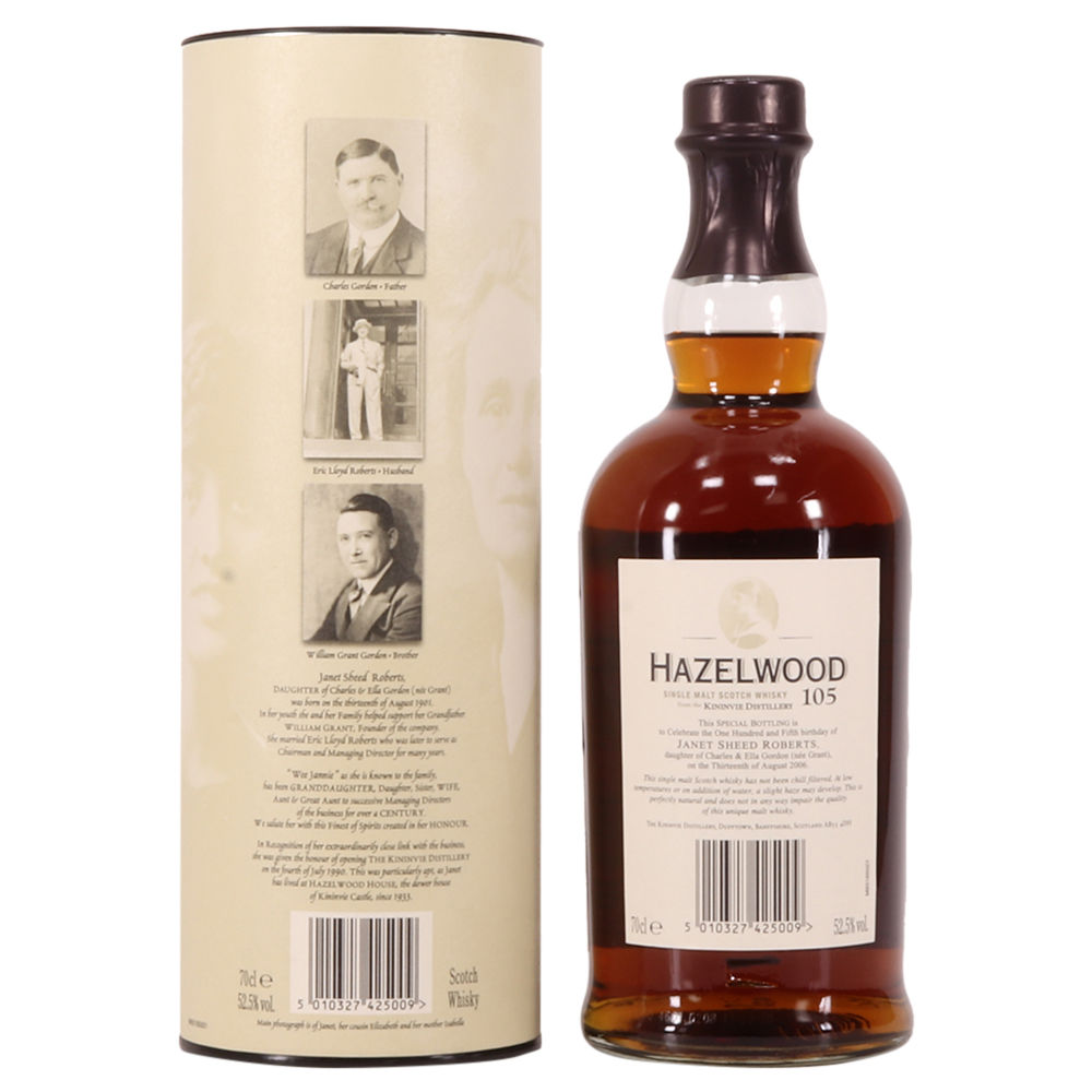 This is a special bottling of Hazelwood whisky to celebrate the 105th birthday of Janet Sheed Roberts on August 13th 2006. It is also it is the first bottling of single malt whisky from Kininvie distillery.