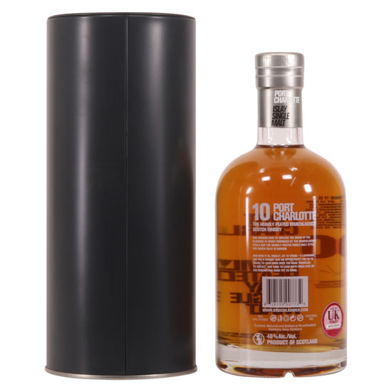 The Port Charlotte 10 Year Old whisky is produced in tall, narrow-necked spirit stills. This creates a lot of reflux and maximizes the amount of copper contact that the vapour receives. The result is a smooth, silky whisky, with noticeable floral elements. Following distillation, the new-make spirit is matured in a combination of first fill ex-bourbon casks (65%), second fill bourbon casks (10%) and second fill French wine casks from Bordeaux (25%). The whisky is bottled on site. Neither chill filtering or caramel is used.