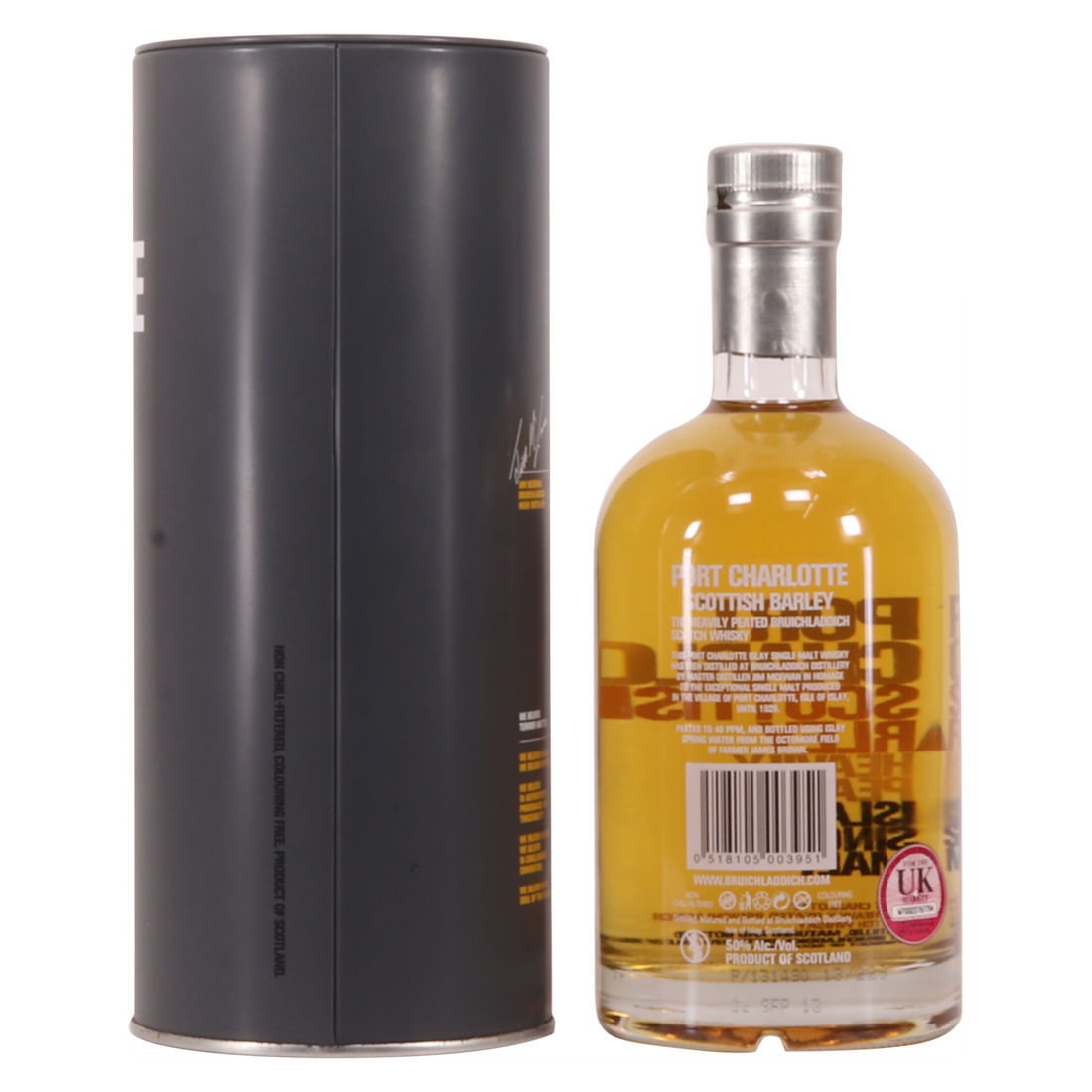 Peated to a heavyweight 40ppm, Port Charlotte Scottish Barley is a cuvee crafted from cask profiles originally selected by master distiller Jim McEwan. It has been trickle distilled using only 100% Scottish Barley then matured in the village of Port Charlotte, before being bottled at the distillery using Islay spring water. It is a dram full of depth and complexity; the flavourful peat & the smokey sweetness of the barley contrasts elegantly with the marine freshness of the spirit and the richness of toffee and vanilla.