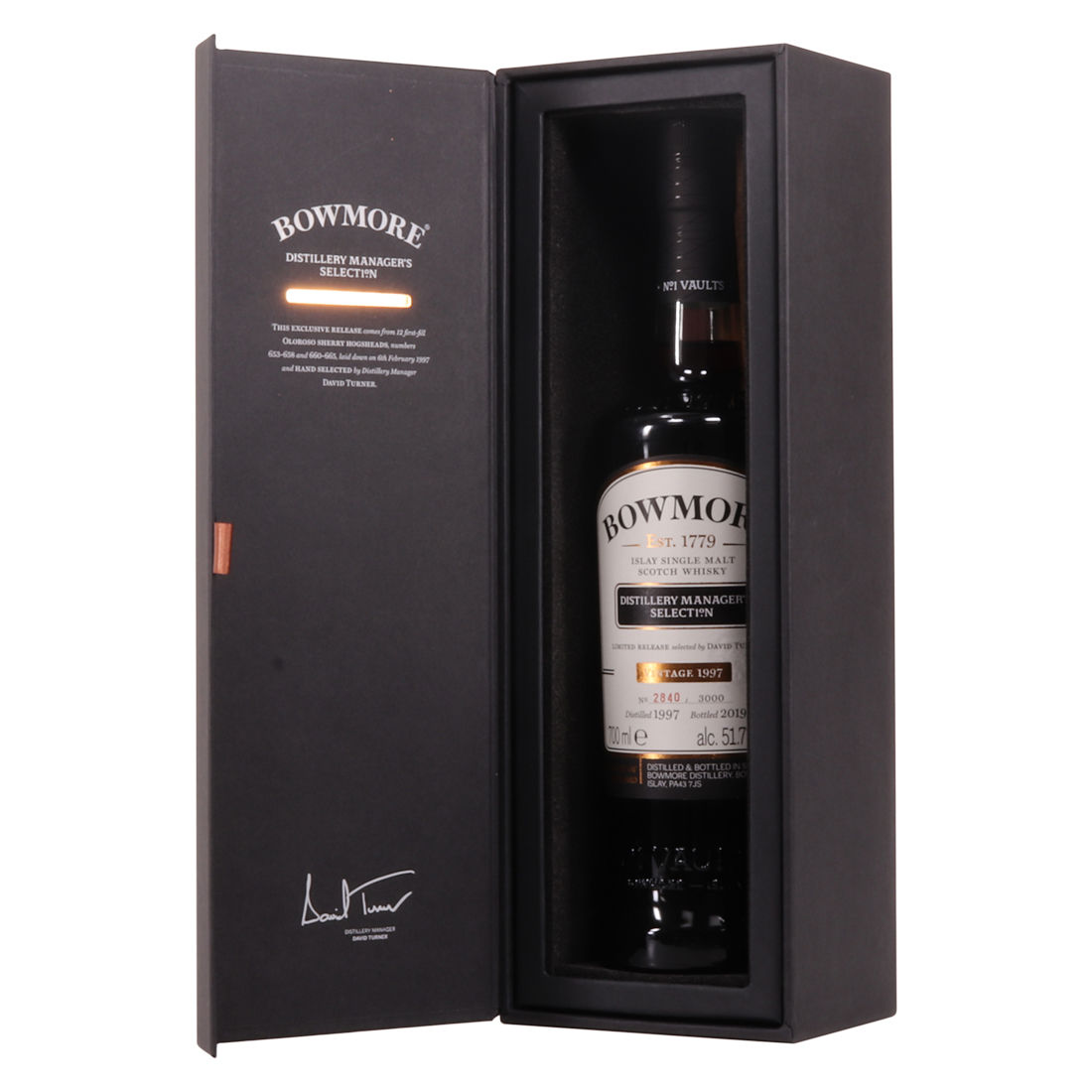 This is one of only 3000 individually numbered bottles, released exclusively at Bowmore Distillery in 2019. This limited release, from the home of the legendary No. Vaults, was specially selected by Distillery Manager David Turner, after being matured in first-fill Oloroso Sherry Hogsheads.