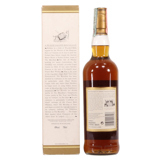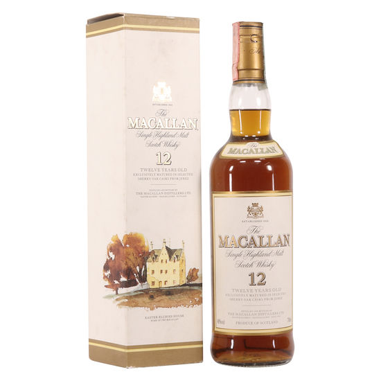 This is an older bottling of The Macallan 12 Year Old. It was exclusively matured in selected sherry oak casks from Jerez, Spain. Comes with presentation box depicting Easter Elchies House.