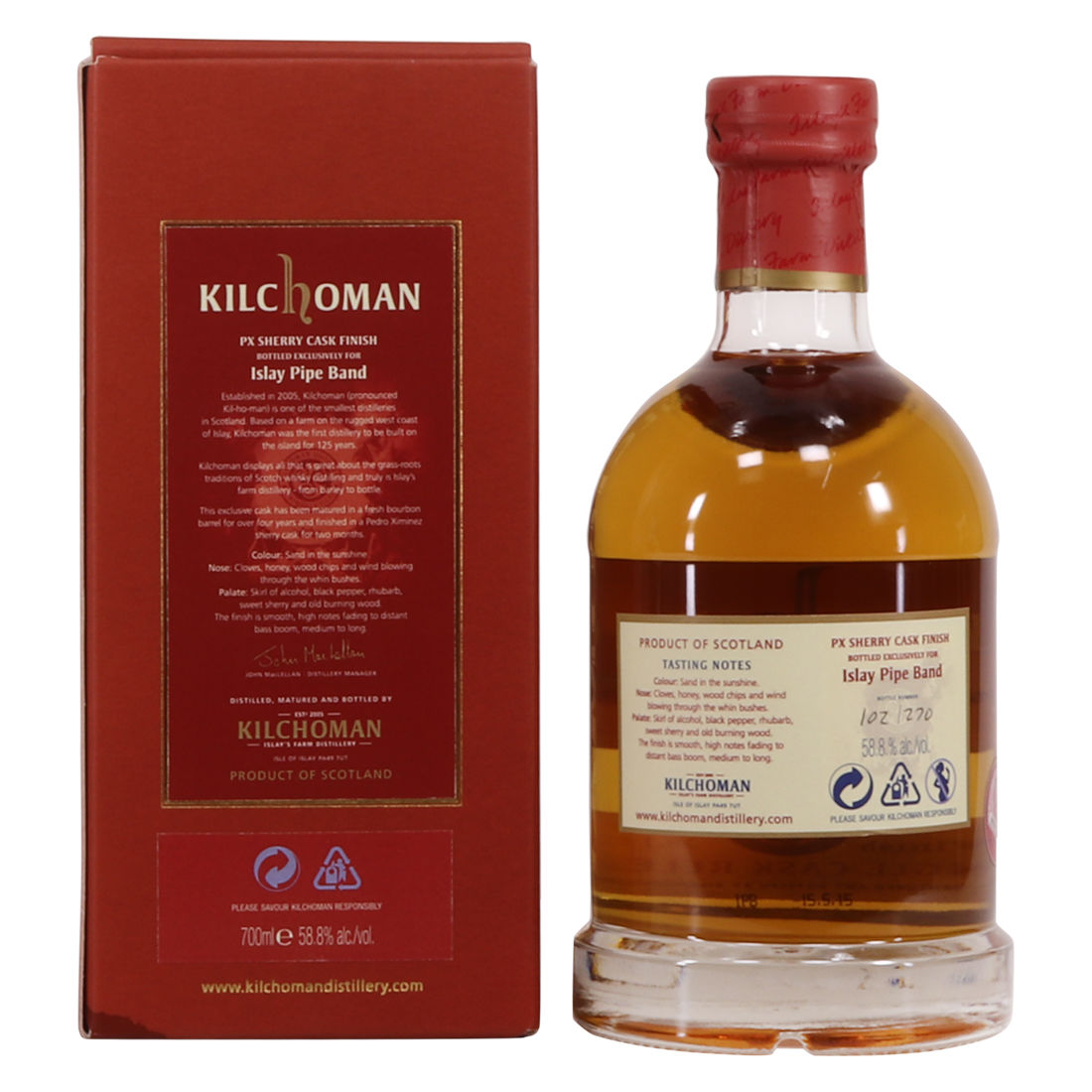 Kilchoman Distillery has sponsored the Islay Pipe Band since 2012 and this sponsorship has taken the form of a cask of whisky selected by John MacLellan, bottled and sold from the distillery with all the proceeds going to the Pipe Band.