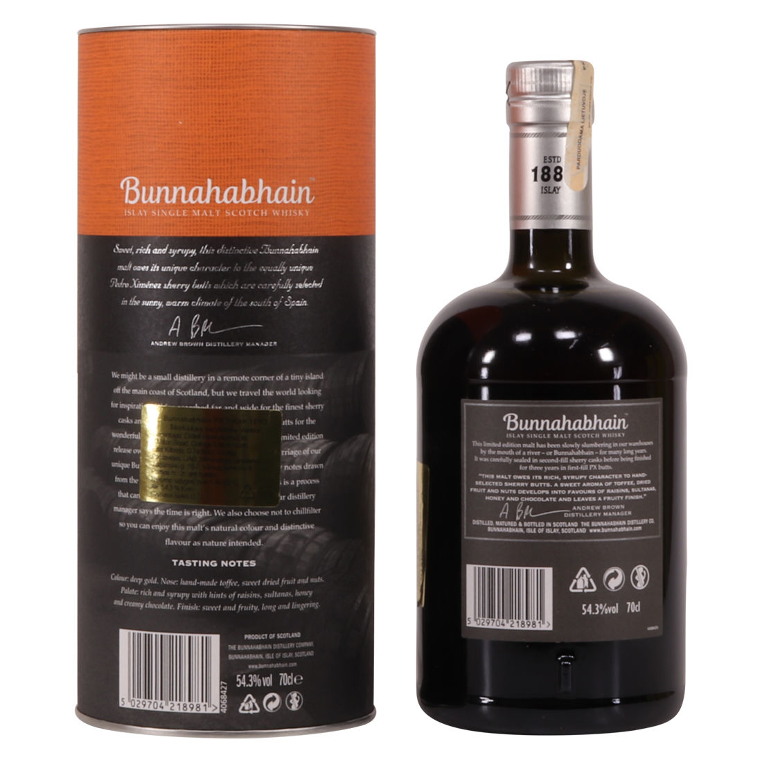 A limited edition bottling from the Bunnahabhain distillery on the north-east coast of Islay. This is a 14 year old single malt, distilled in 2003 and was initially aged in second-fill Sherry casks until 2011. At this point, the whisky was transferred over to yet more Sherry casks - first-fill Pedro Ximénez casks! It was bottled in 2017 at cask strength. This is one of individually numbered 6768 bottles. This bottle is an import.